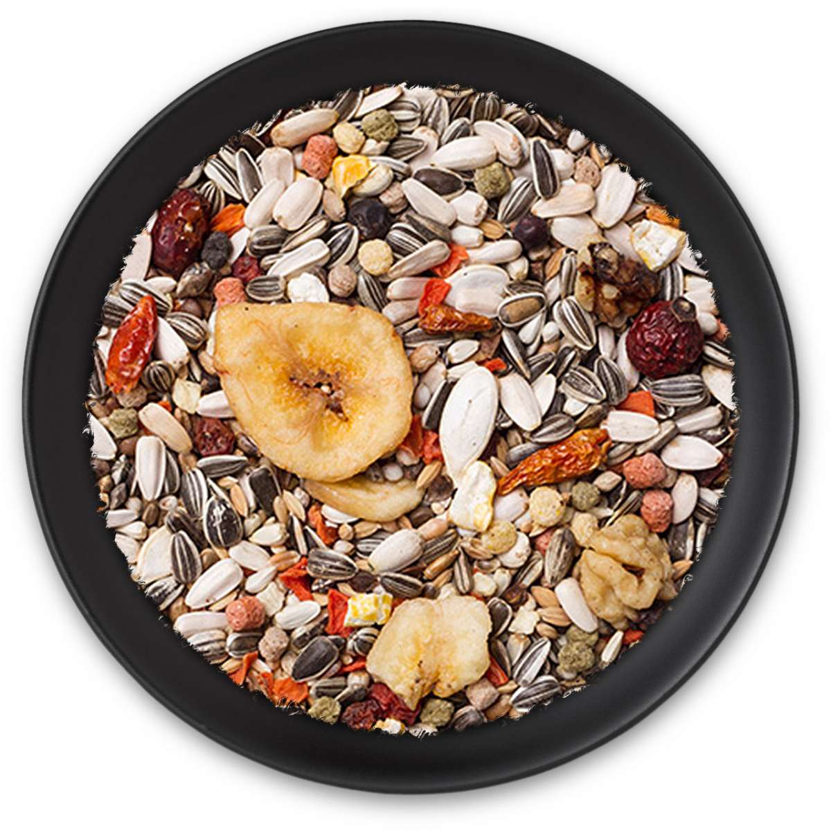 Słonecznik paskowany, biały słonecznik, sorgo białe, pszenica, ryż niełuskany, gryka, proso żółte, nasiona konopi, granulat witaminowy, owies łuskany, grit, proso srebrne, marchewka, banan, nasiona dyni, siemię, owoce jarzębiny, ostropest plamisty, jagoda jałowca, proso japońskie, jabłko, dzika róża, orzech włoski, rodzynki, prażona kukurydza, łuskane orzeszki ziemne, papryka chilli.