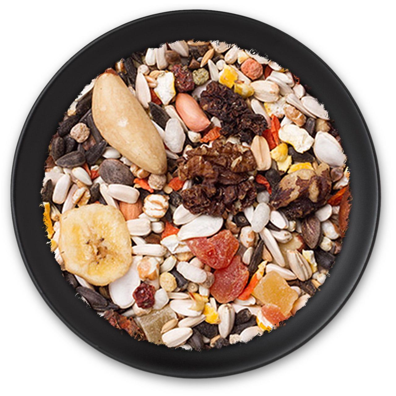 Słonecznik czarny, paskowany i biały, krokosz, sorgo białe, gryka, kukurydza preparowana, nasiona dyni, orzechy cedrowe, orzechy brazylijskie, pszenica, pszenica preparowana, granulat, łuskane orzeszki ziemne, grit, owoce dzikiej róży, ryż niełuskany, owies łuskany, marchewka, orzechy włoskie, ostropest plamisty, owoce jarzębiny, banan, ananas, papaja, papryczki chilli.