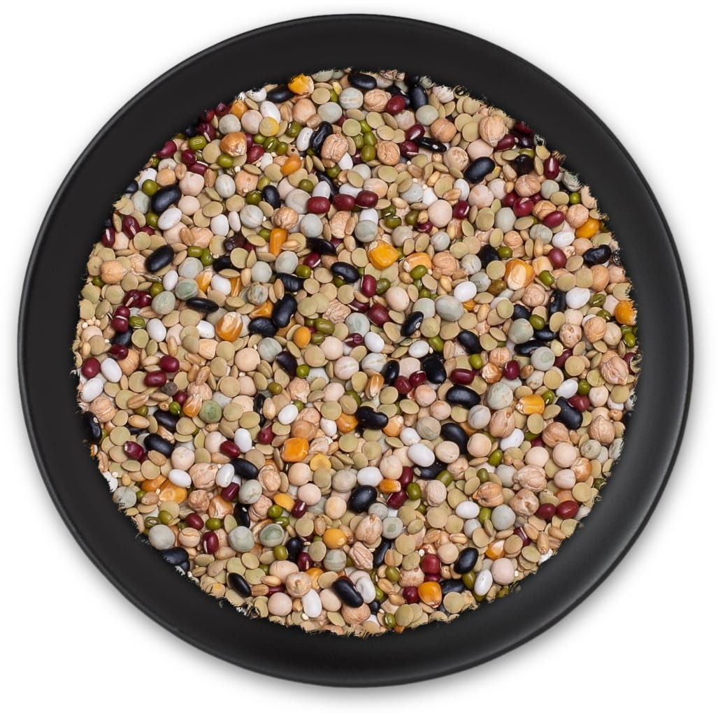 Skład: Soczewica, ciecierzyca 7/8 mm, zielony groszek, żółty groszek, biała pszenica, komosa ryżowa, groszek zielony, fasola Azuki, kukurydza Plata, czarna fasola, biała fasola