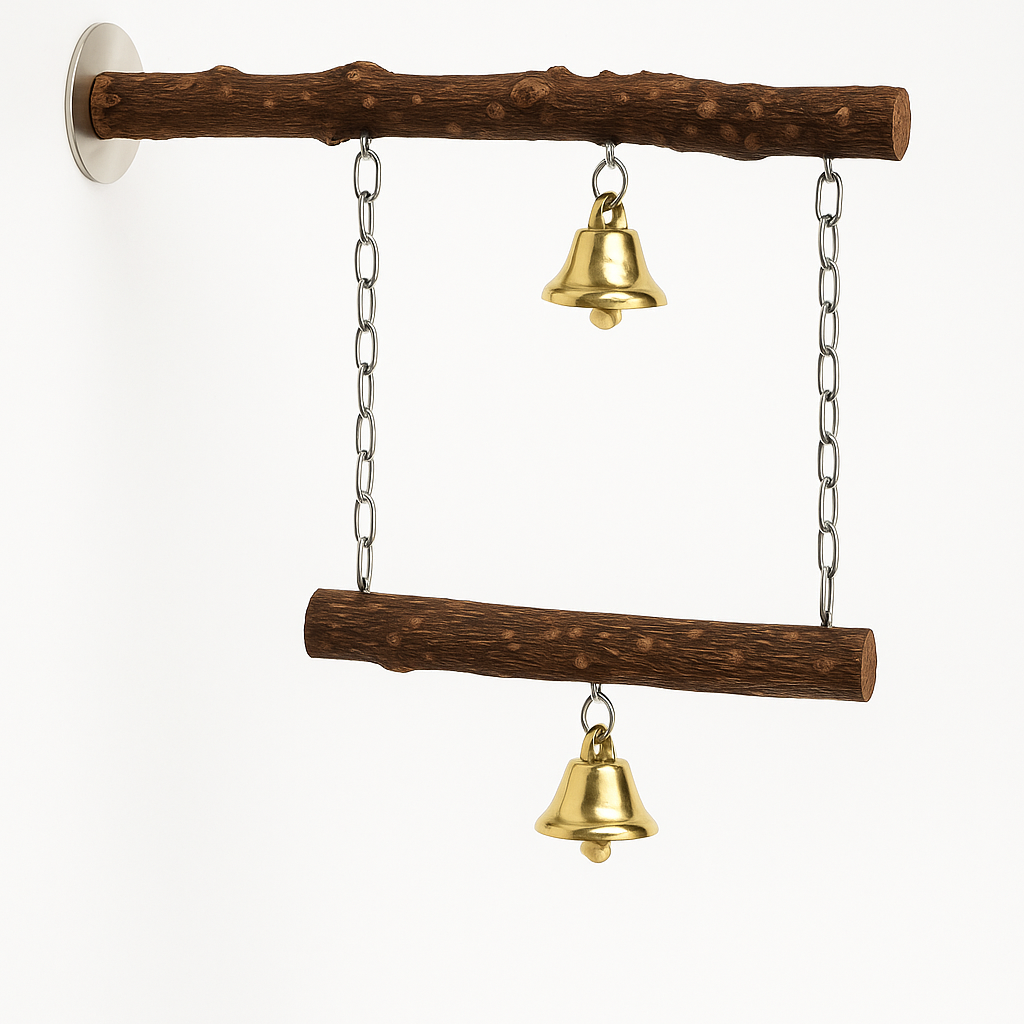 to wyjątkowa huśtawka stworzona z myślą o papugach, które kochają ruch, dźwięki i naturalne materiały. Dwie solidne, naturalne gałązki połączone metalowym łańcuszkiem tworzą stabilną, podwójną konstrukcję, która zachęca do bujania, wspinania i eksploracji. Delikatnie połyskujące dzwoneczki wydają przyjemny dźwięk przy każdym poruszeniu, pobudzając ciekawość i aktywność ptaka.