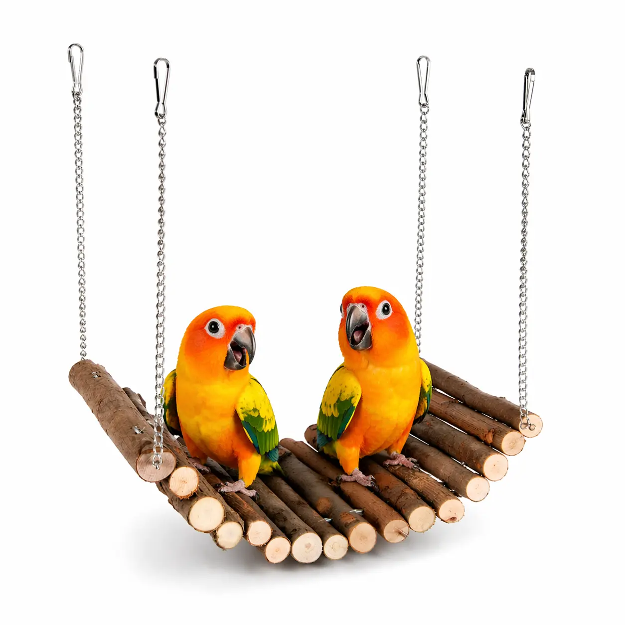 Naturalny most wiszący z drewna, który wprowadza do klatki lub wybiegu ruch, balans i nowe możliwości eksploracji. Papuga zyskuje miejsce do chodzenia, wspinania i zabawy, które realnie angażuje ciało i głowę.
