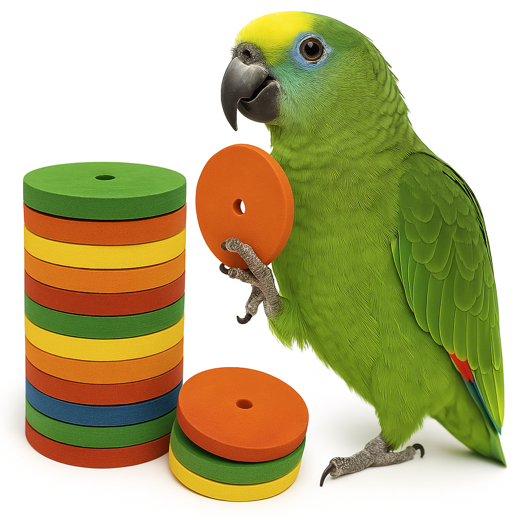 Rozmiar dysków to 4 cm średnicy, 2,4 cm grubości i 0,9 cm wysokości. Są one łatwe do chwytania i manipulowania przez Twoją papugę, zapewniając stymulujący trening dla jej dzioba i umysłu.