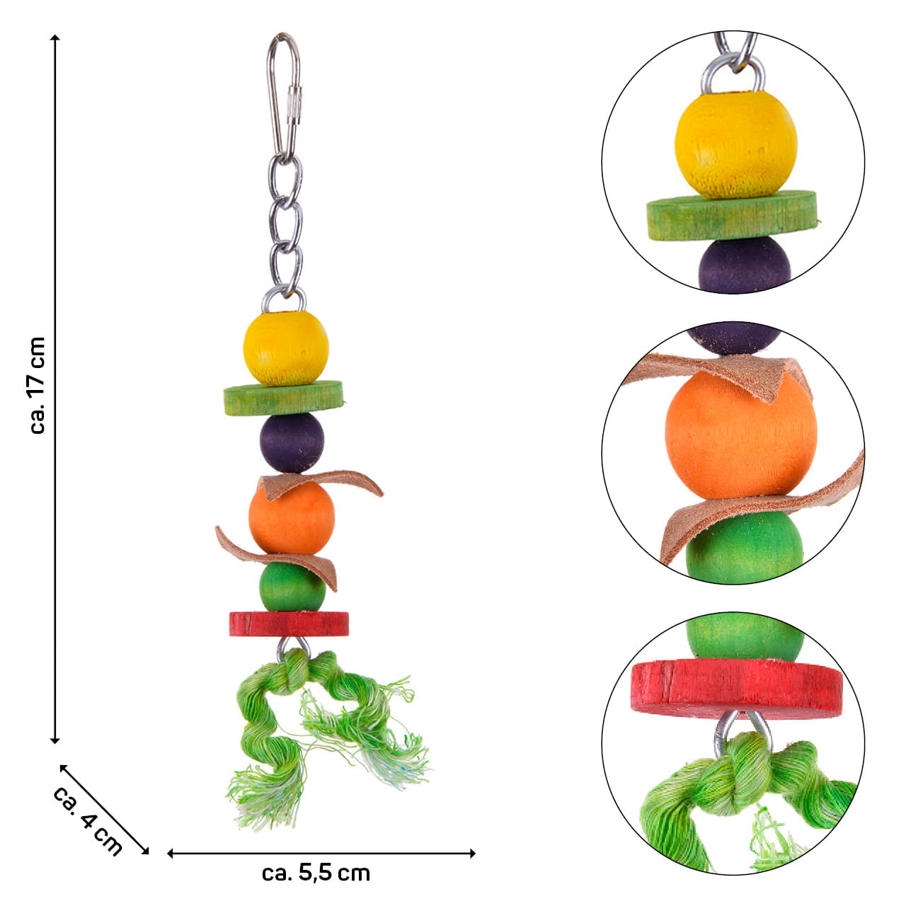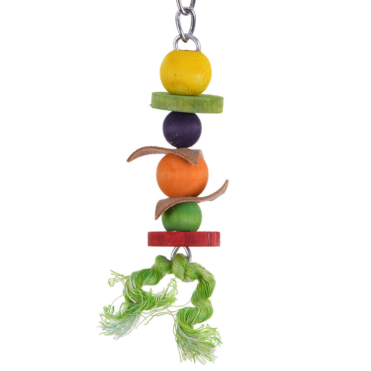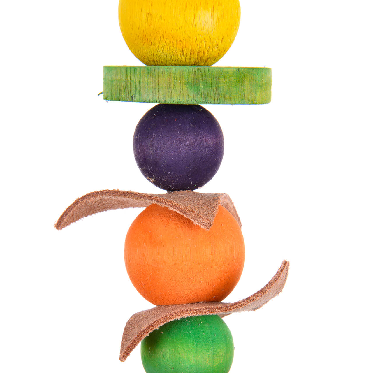 Malutka, naturalna zabawka dla papug wykonana z drewna i skóry zakończona dzwoneczkiem.