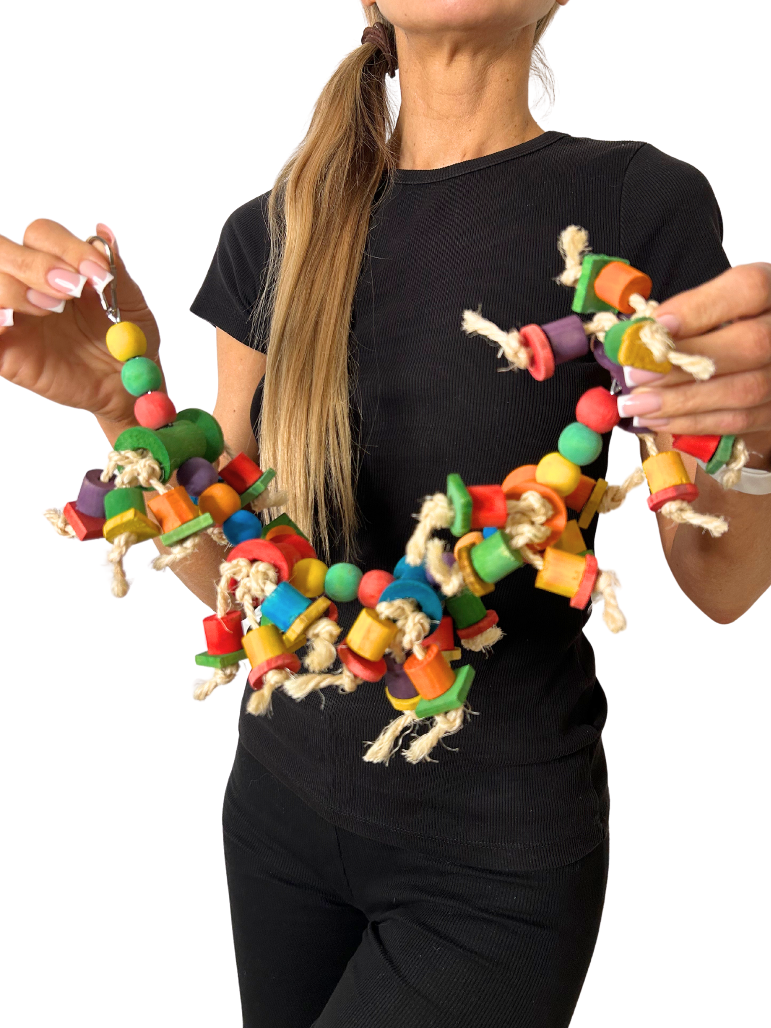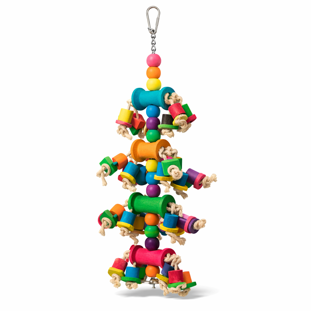 Happy Fun to zawieszana zabawka o długości 44 cm, zaprojektowana tak, aby angażować ptaka na wielu poziomach – ruch, chwytanie, rozrywanie i manipulowanie elementami. Różnorodne faktury oraz materiały zachęcają do eksploracji i naturalnego niszczenia.