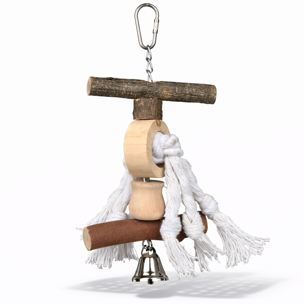 Idealna Zabawka to kompaktowa, intensywnie angażująca konstrukcja stworzona z myślą o papugach, które uwielbiają niszczyć i manipulować elementami. Połączenie drewnianych części o różnych kolorach i fakturach z miękkimi bawełnianymi sznurkami zapewnia różnorodność bodźców.