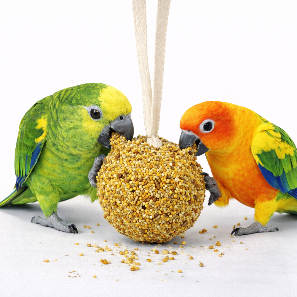 Forma baryłki sprawia, że papuga musi pracować dziobem i łapkami, co wspiera naturalne ścieranie dzioba i redukuje nudę. To karma uzupełniająca przeznaczona jako przekąska.