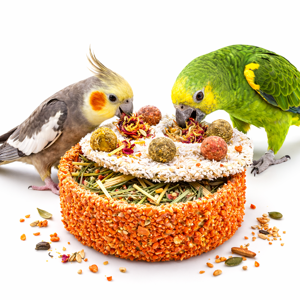 Po zjedzeniu części wypełnienia wykorzystaj zdejmowaną pokrywę i ukryj w środku drobne przysmaki lub suszone zioła. Dzięki temu ciacho stanie się zabawką do żerowania i zajmie papugę na dłużej.
