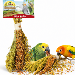 JR FARM Pick & Fly to naturalny suplement diety dla papug w formie bukieciku kłosów i całych nasion. Produkt zawiera starannie dobrane rośliny, które dojrzewają w naturalnych warunkach, dzięki czemu zachowują swój aromat i strukturę.