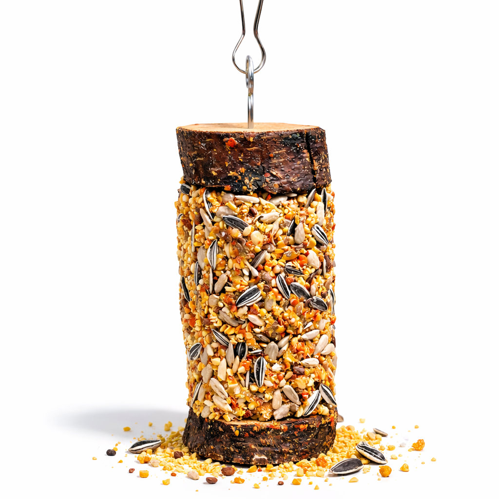 Forma osadzona w drewnie wydłuża czas zajęcia i wspiera naturalne zachowania żerowania. To karma uzupełniająca przeznaczona jako przysmak.