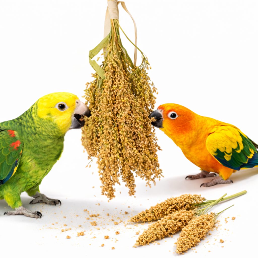 Forma całych kłosów pobudza instynkt żerowania, wspiera aktywność i pozwala na naturalne ścieranie dzioba. Proso rozpierzchłe jest lekkostrawne i chętnie akceptowane przez małe, średnie oraz duże gatunki papug.