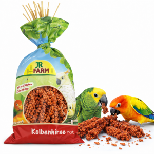 JR FARM Spray Millet Red to wysokiej jakości czerwone proso w naturalnych, nieprzetworzonych kłosach. To forma pokarmu najbardziej zbliżona do naturalnego sposobu zdobywania pożywienia przez papugi w środowisku dzikim.