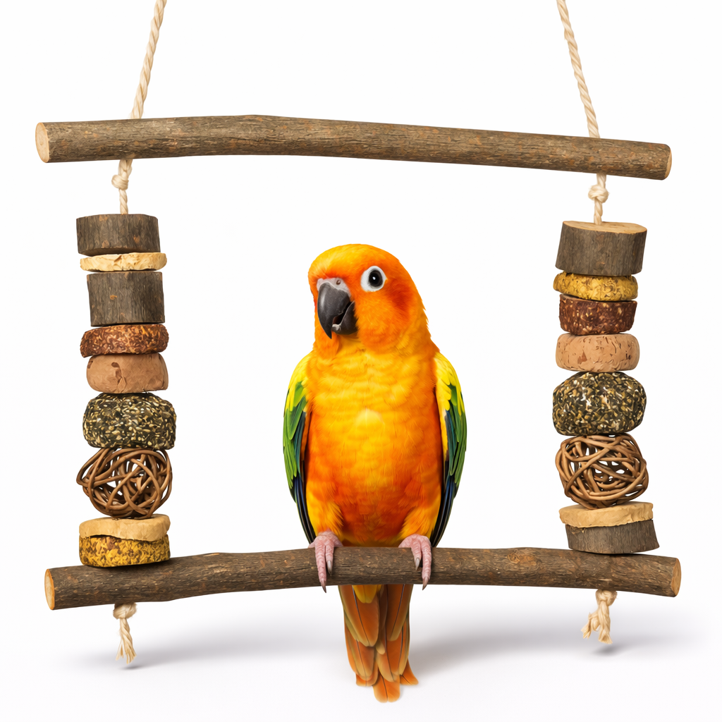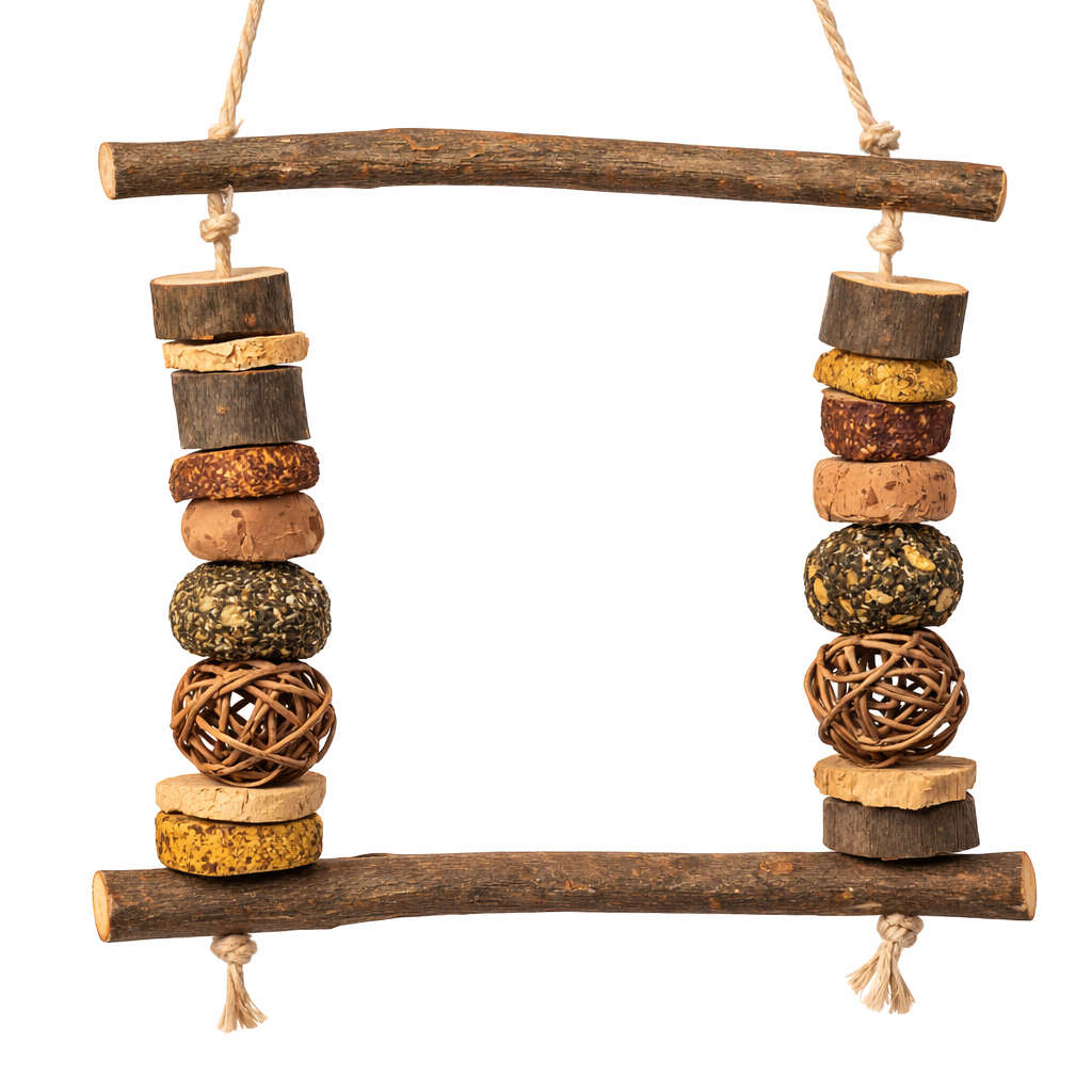 Huśtawka zachęca papugi do wspinania się, balansowania i podgryzania, co wspiera naturalne zachowania żerowania oraz pomaga zapobiegać nudzie. Obecność owoców i warzyw w ciasteczkach dostarcza dodatkowych składników odżywczych, a naturalne drewno i korek umożliwiają bezpieczne skubanie.