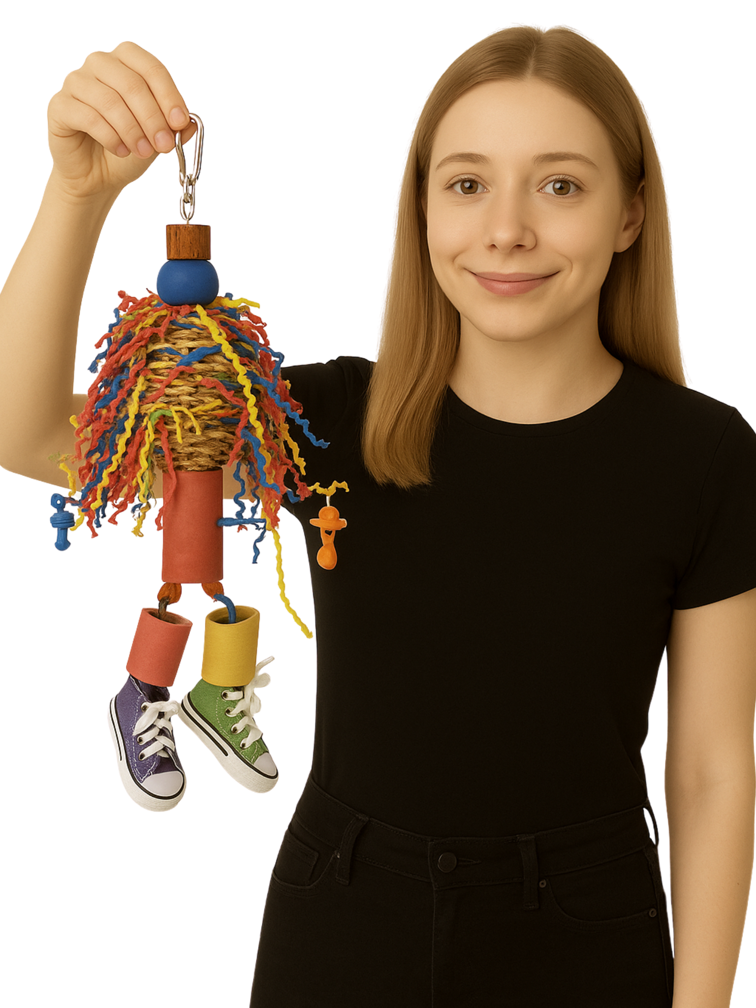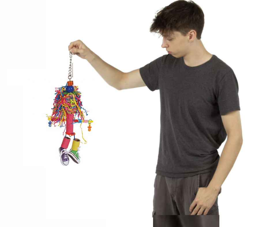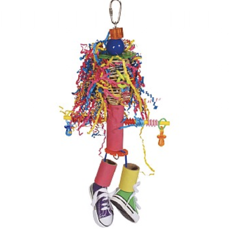 Jamaica Crazy Girl - to wyjątkowo misternie wykonana zabawka dla papug. Zabawka stanowi połączenie wielu materiałów: Kul z wikliny, kolorowego drewna, kolorowego papieru ZIGZAG, oraz ulubionych papuzich trampków.