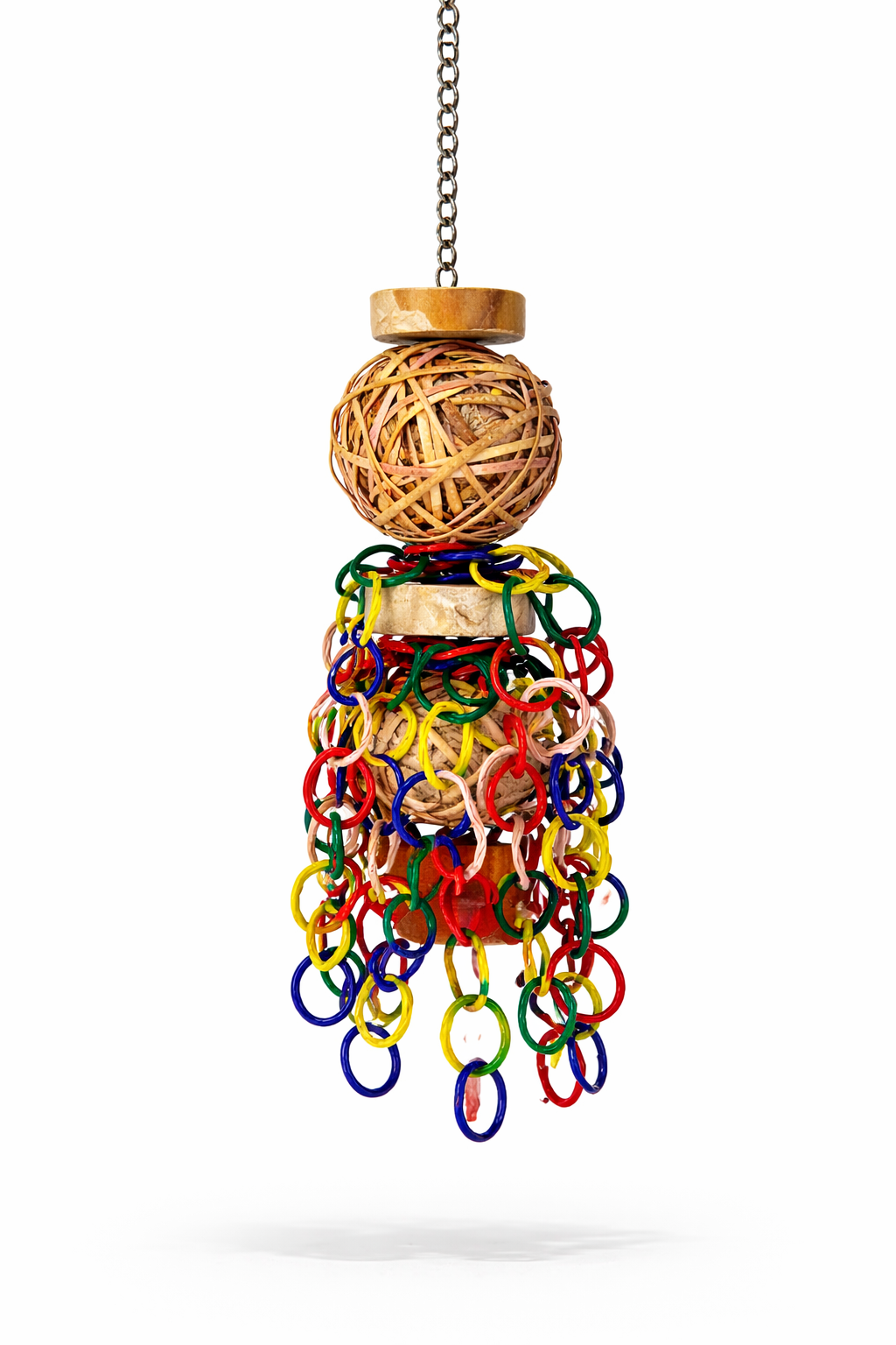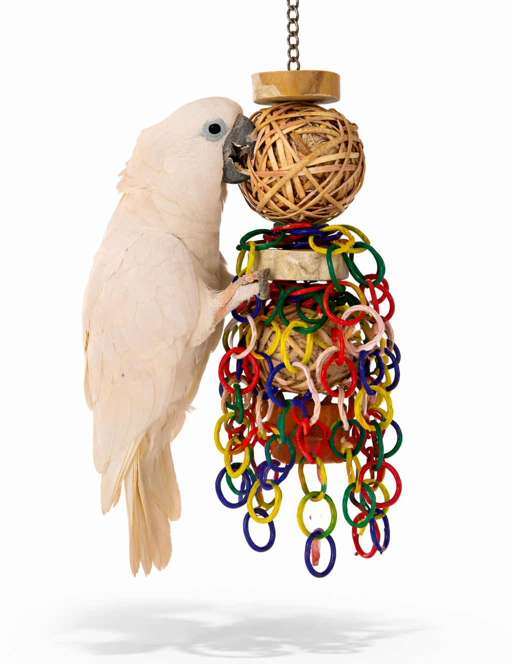 Wytrzymały łańcuch oraz solidny karabińczyk umożliwiają bezpieczne zawieszenie w klatce lub wolierze. To model przeznaczony do intensywnego użytkowania – dla papug, które szybko rozprawiają się z delikatniejszymi zabawkami.