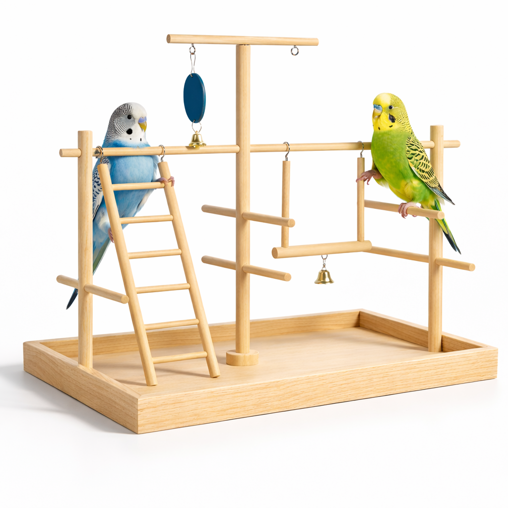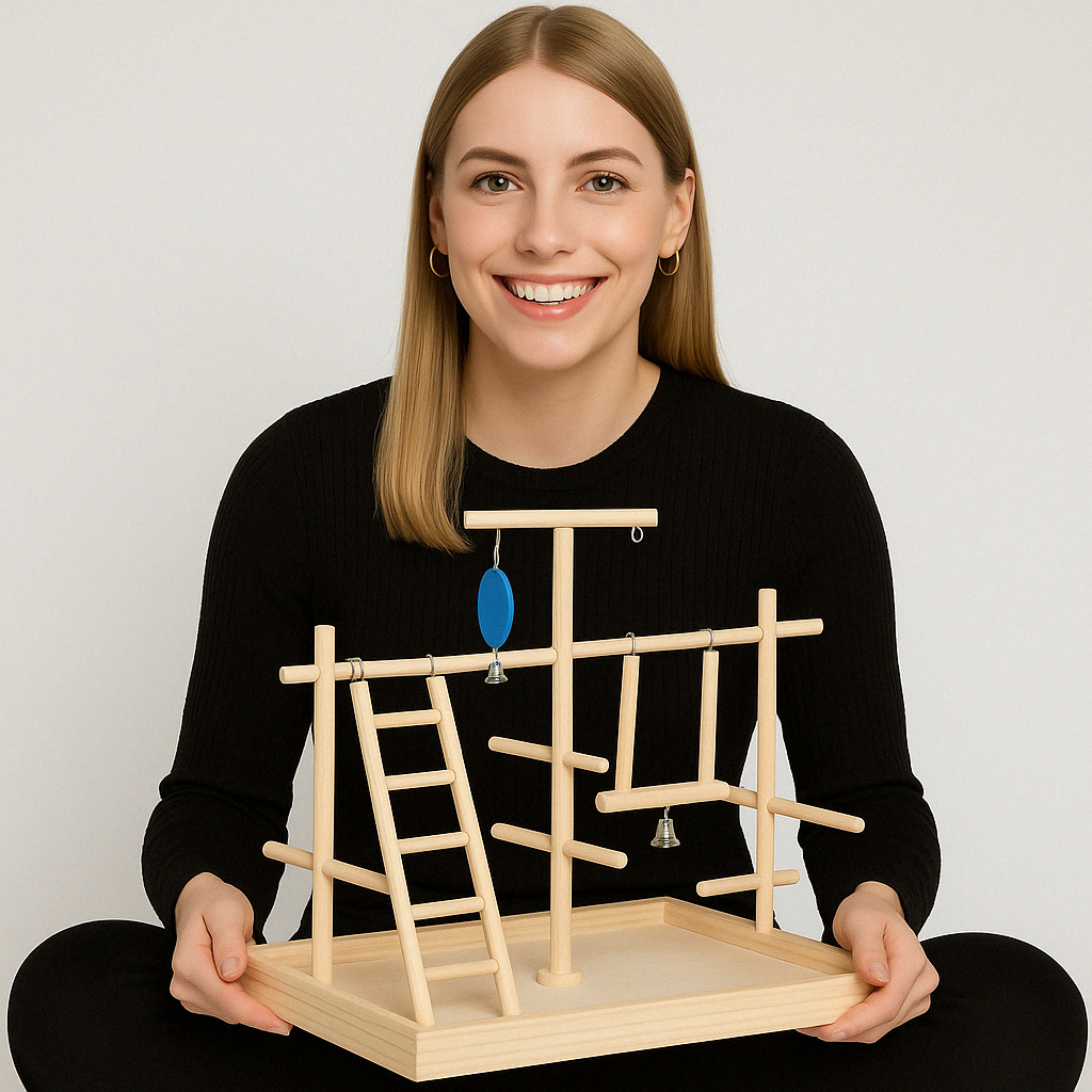 Jungle Station to solidny, drewniany plac zabaw zaprojektowany tak, aby wspierać naturalne potrzeby papug: wspinanie się, balansowanie, obserwację otoczenia i aktywność poza klatką.