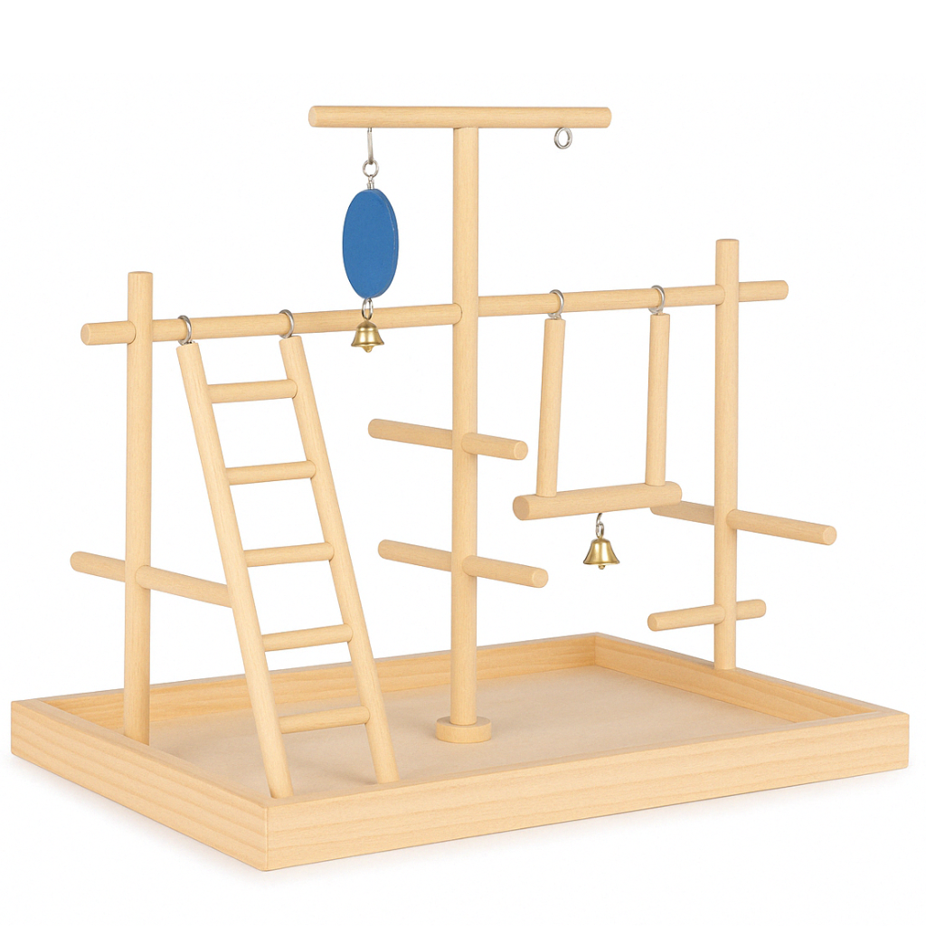 Ustawić jako wolnostojący plac zabaw poza klatką lub w przestrzeni woliery. Regularnie kontrolować stan elementów drewnianych.