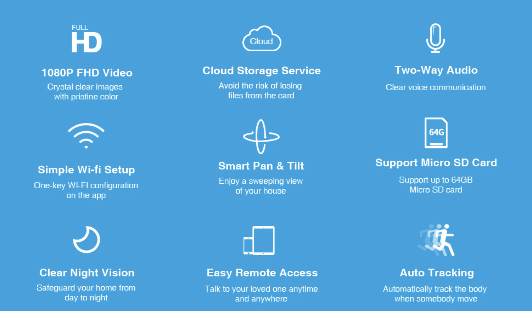 Kamera posiada możliwość zaprogramowania funkcji takich jak wykrywanie ruchu oraz wysyłanie powiadomień o aktywnościach, można również zaprogramować, aby wykrywała ruch i podążała za nim.