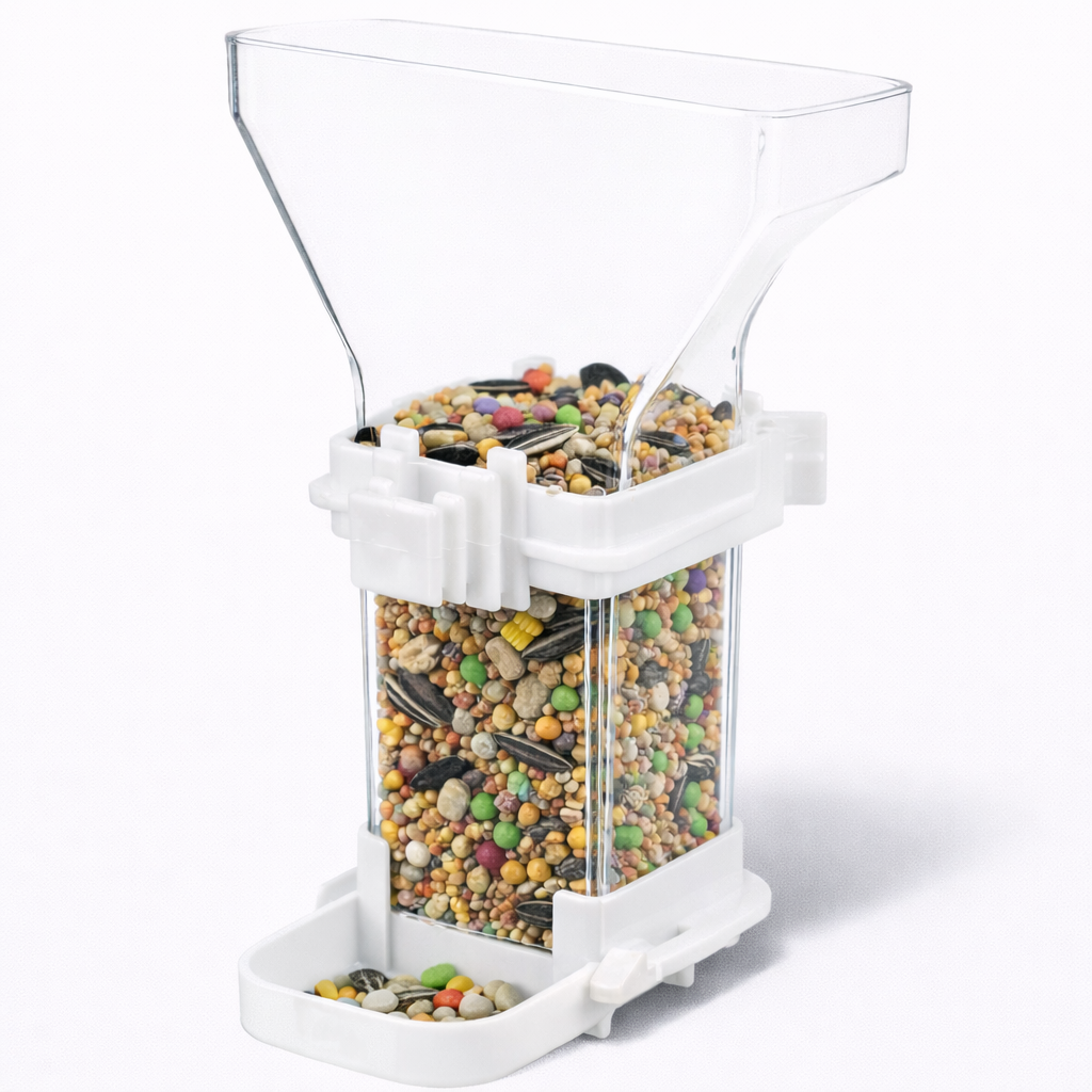 Karmidełko Zasypowe 150 ml – dla Papug i Ptaków Egzotycznych to funkcjonalne rozwiązanie, które ułatwia codzienne karmienie i pomaga ograniczyć marnowanie pokarmu. System napełniania od góry pozwala szybko uzupełnić ziarno bez konieczności demontażu całej konstrukcji.