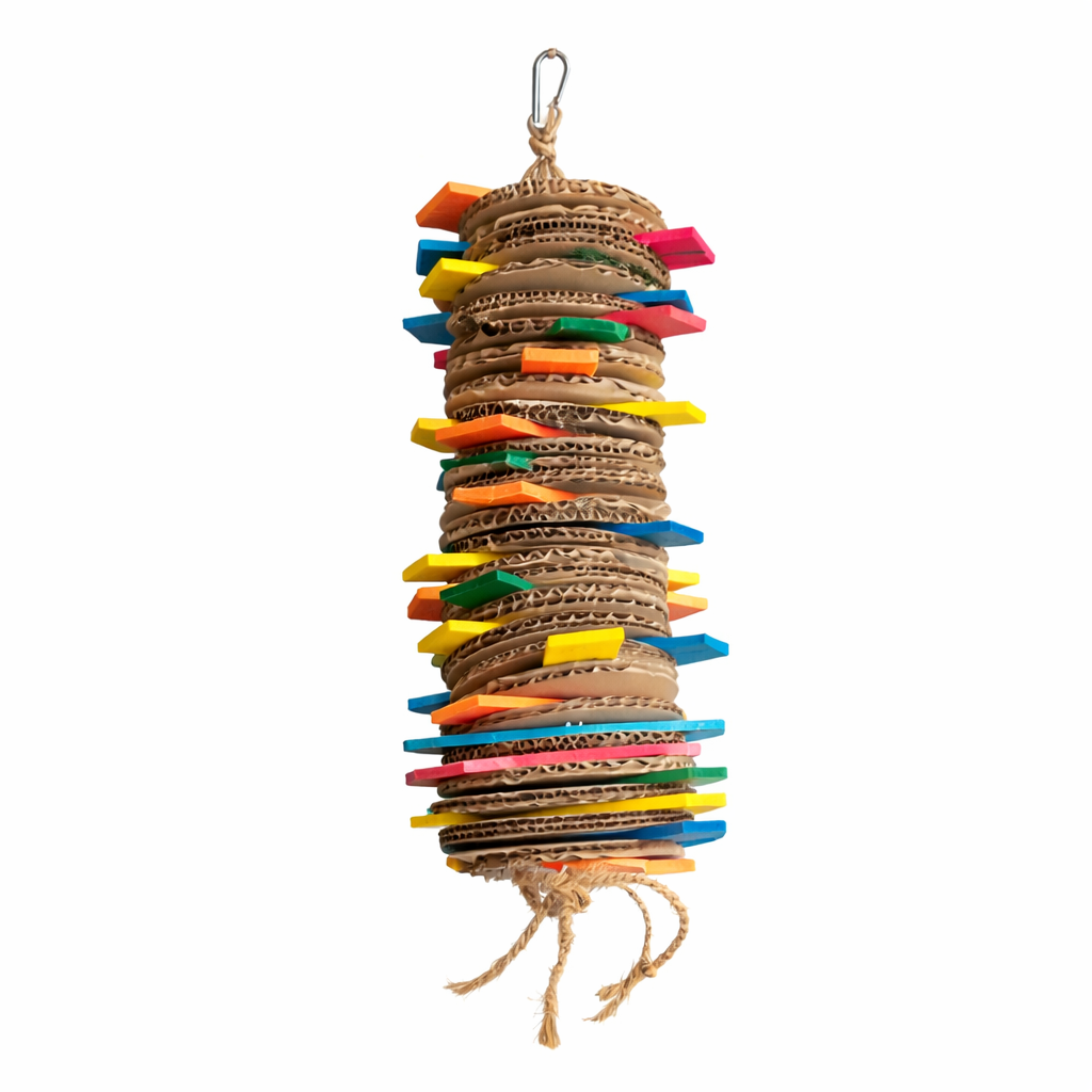 Kartonowa zabawka do niszczenia została wykonana z warstw falistego kartonu ułożonych w formie pionowego stosu, pomiędzy którymi znajdują się kolorowe drewniane elementy. Taka konstrukcja zachęca papugi do skubania, rozrywania i eksplorowania zabawki, co doskonale odpowiada ich naturalnemu instynktowi żerowania i niszczenia materiałów roślinnych.