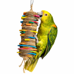 Miękka struktura kartonu sprawia, że ptaki mogą łatwo rozdzielać kolejne warstwy, dzięki czemu zabawka zapewnia długotrwałą aktywność i pomaga ograniczyć nudę w klatce. Kolorowe drewniane elementy dodatkowo przyciągają uwagę papugi i zwiększają atrakcyjność zabawy.