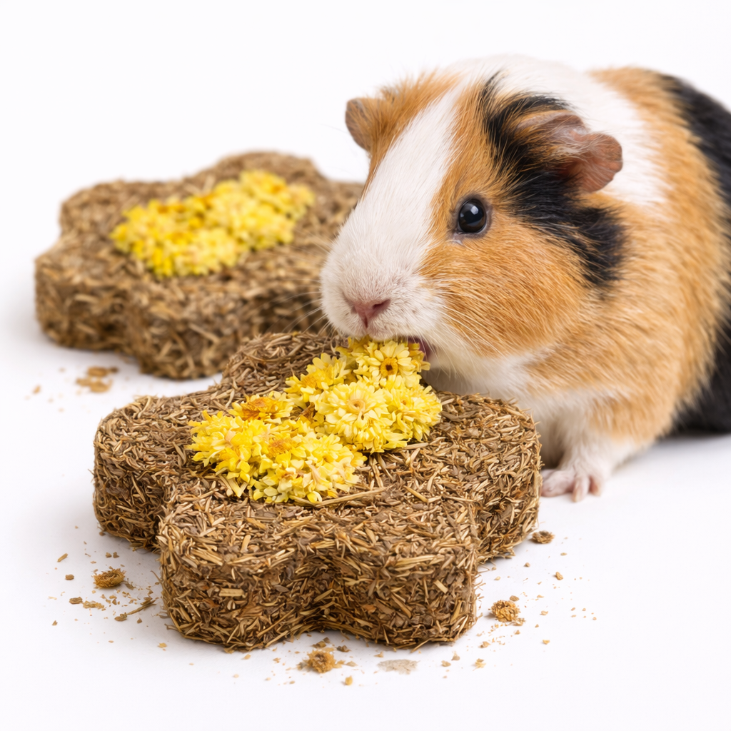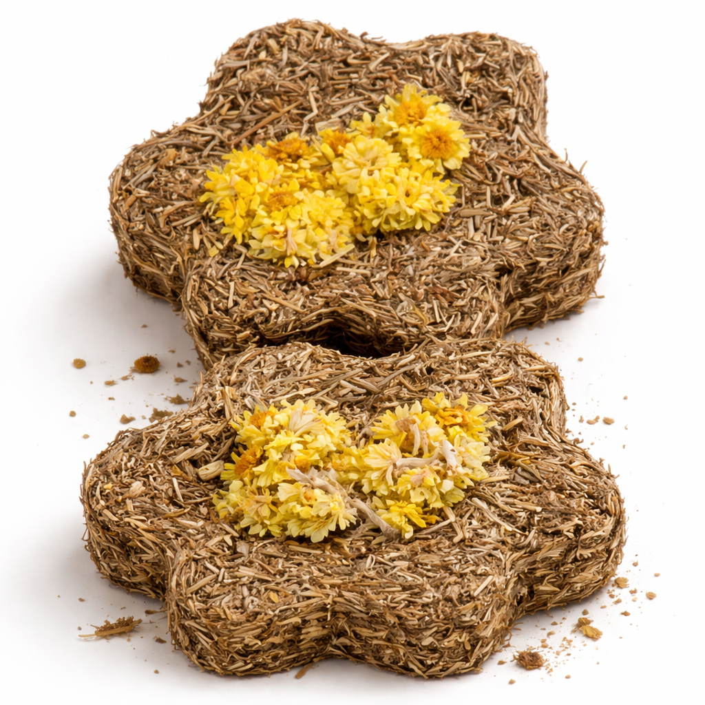 Bazę przekąski stanowi siano, będące kluczowym elementem żywienia gryzoni. Wysoka zawartość koniczyny (min. 20%) wzbogaca smak i strukturę przekąski, a dodatek kwiatu kocanki i bazylii nadaje jej naturalny aromat. Siemię lniane uzupełnia skład o element smakowy i teksturalny.