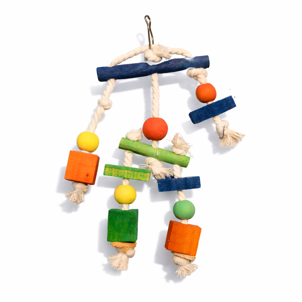 Klocki i Sznurki to klasyczna, ale niezwykle skuteczna zabawka aktywizująca dla papug w każdym rozmiarze. Zestaw kolorowych drewnianych klocków o zróżnicowanych kształtach został połączony bawełnianymi sznurkami oraz elementami, które zachęcają do ciągnięcia, skubania i rozdrabniania.