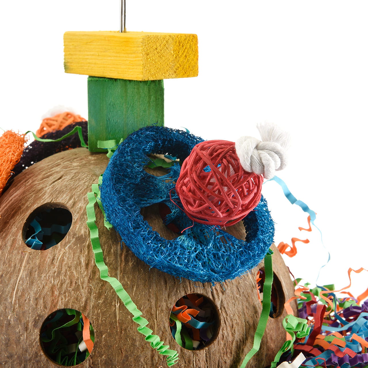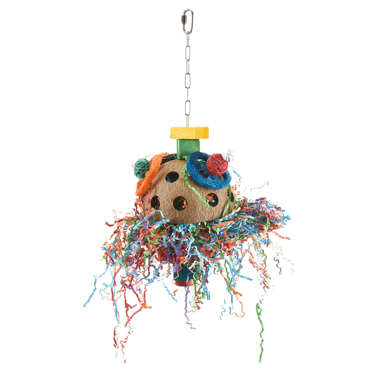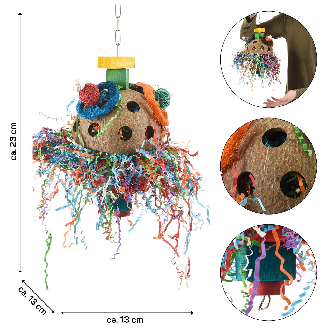 Wyjątkowe Materiały: Zabawka składa się z naturalnej łupiny orzecha kokosowego, która jest wyposażona w otwory, a także kolorowej kuli z papieru Zig Zag. To połączenie zapewnia różnorodność tekstur i bodźców, które przyciągają papugę do zabawy.