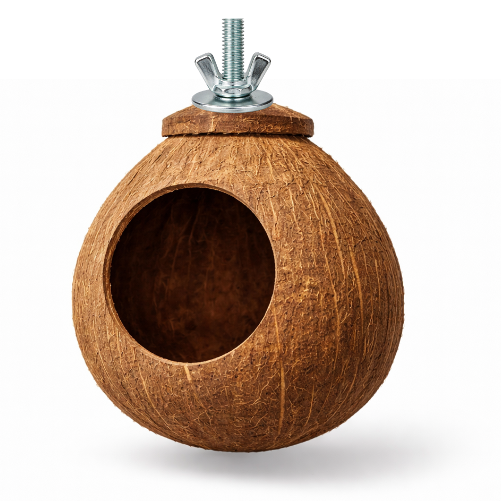 Kokosowa Dziupla jest polecana głównie dla średnich i małych papug, takich jak nimfy, które docenią możliwość wytchnienia w swoim własnym małym kokosowym azylu.