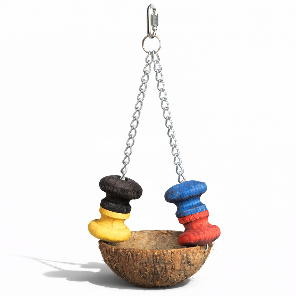 Kokosowy Raj to funkcjonalne połączenie huśtawki i naturalnego karmnika, wykonane z prawdziwej skorupy kokosa. Zaprojektowany z myślą o papugach, które potrzebują ruchu, eksploracji i stymulacji umysłowej.