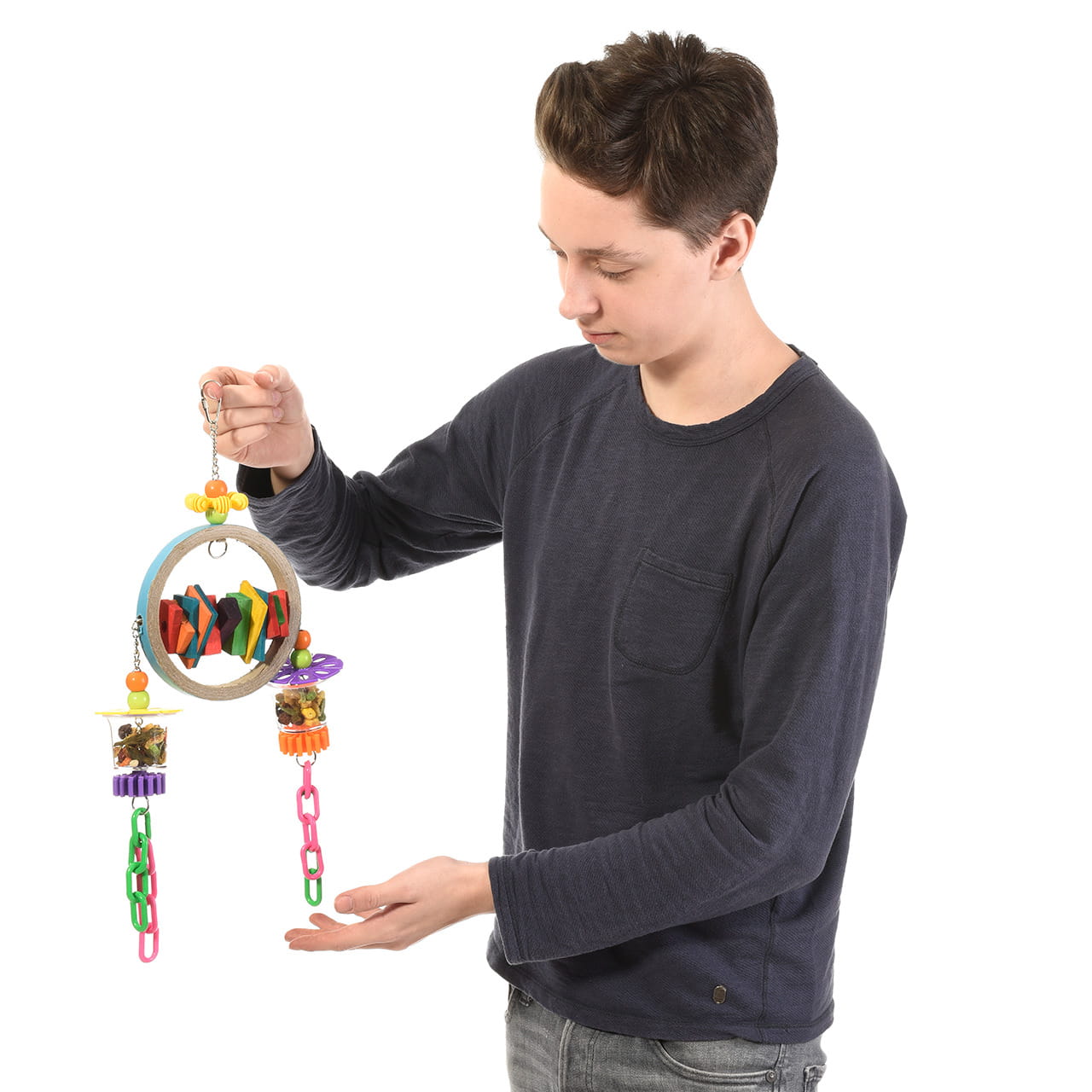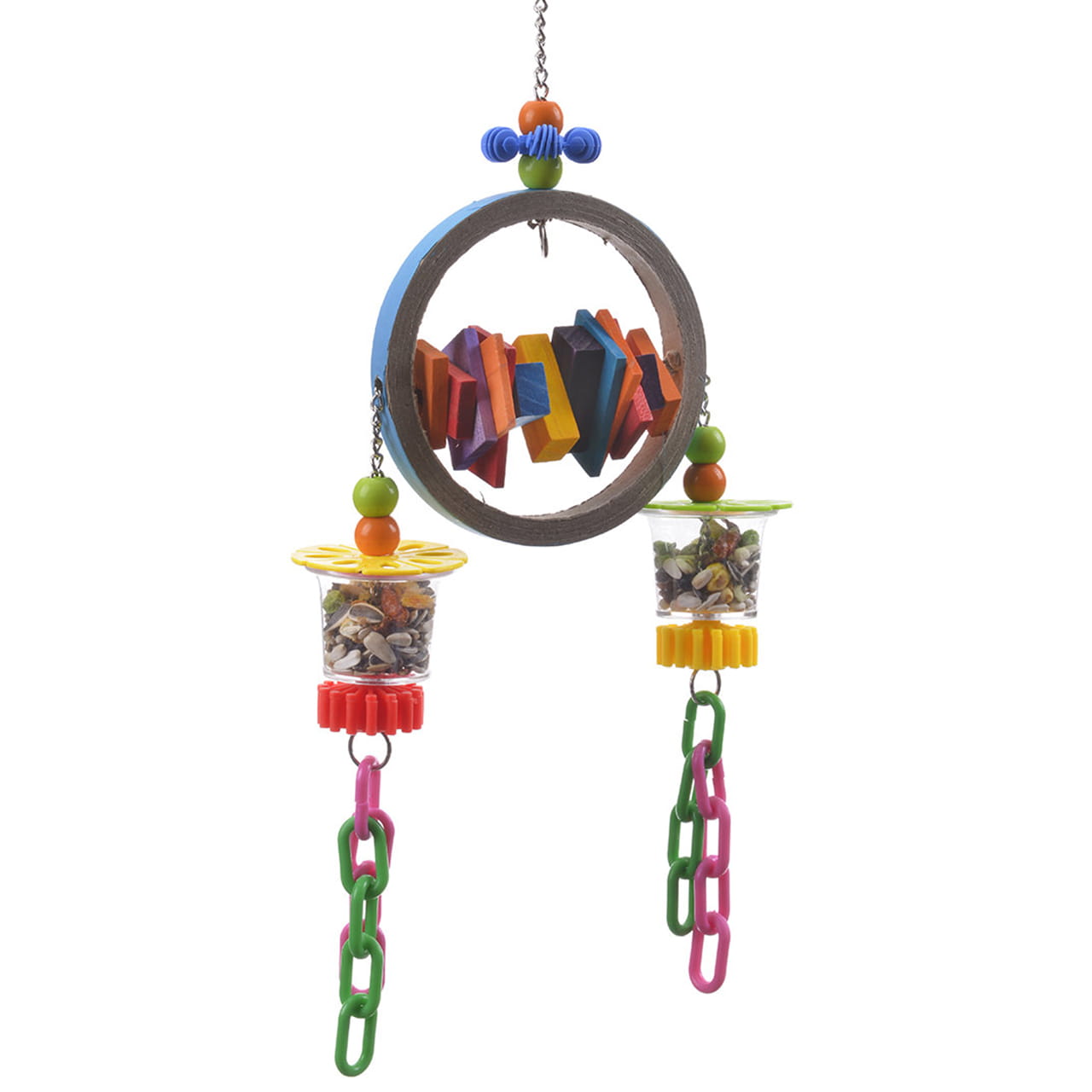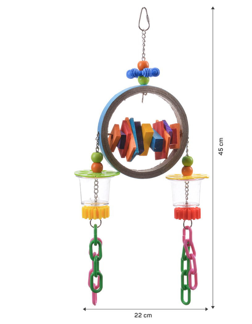 Kolorowy Bagiel to doskonała zabawka dla średnich i dużych papug, która zapewni im godziny rozrywki. Wielokolorowe klocki, łańcuszki i pojemniczki na pokarm zapewniają różnorodność i wyzwania dla papugi, pobudzając jej zmysły i rozwijając zdolności poznawcze. Wytrzymała konstrukcja zapewnia trwałość zabawki, a jej uniwersalny charakter sprawia, że jest odpowiednia dla różnych gatunków papug. Wybierz Kolorowy Bagiel, aby zapewnić swojej papudze nie tylko zabawę, ale także rozwój i dobre samopoczucie.