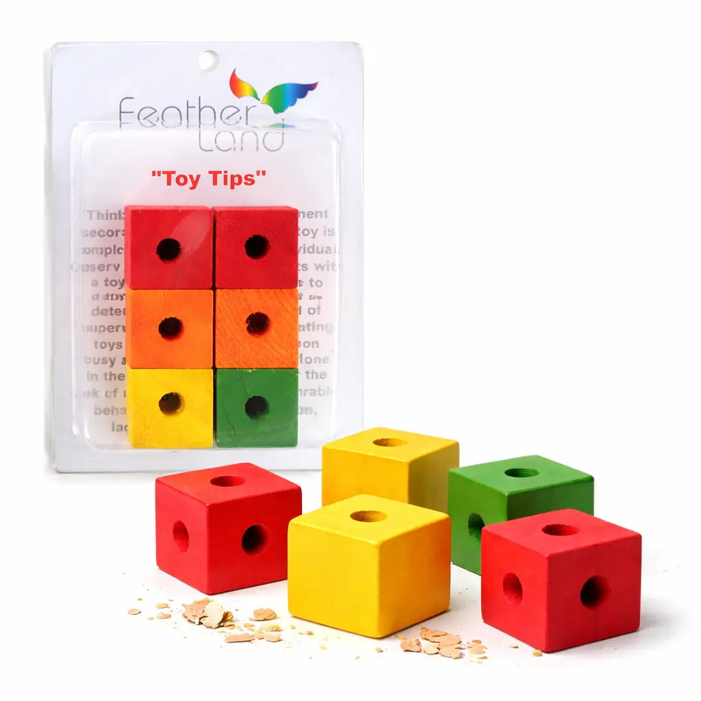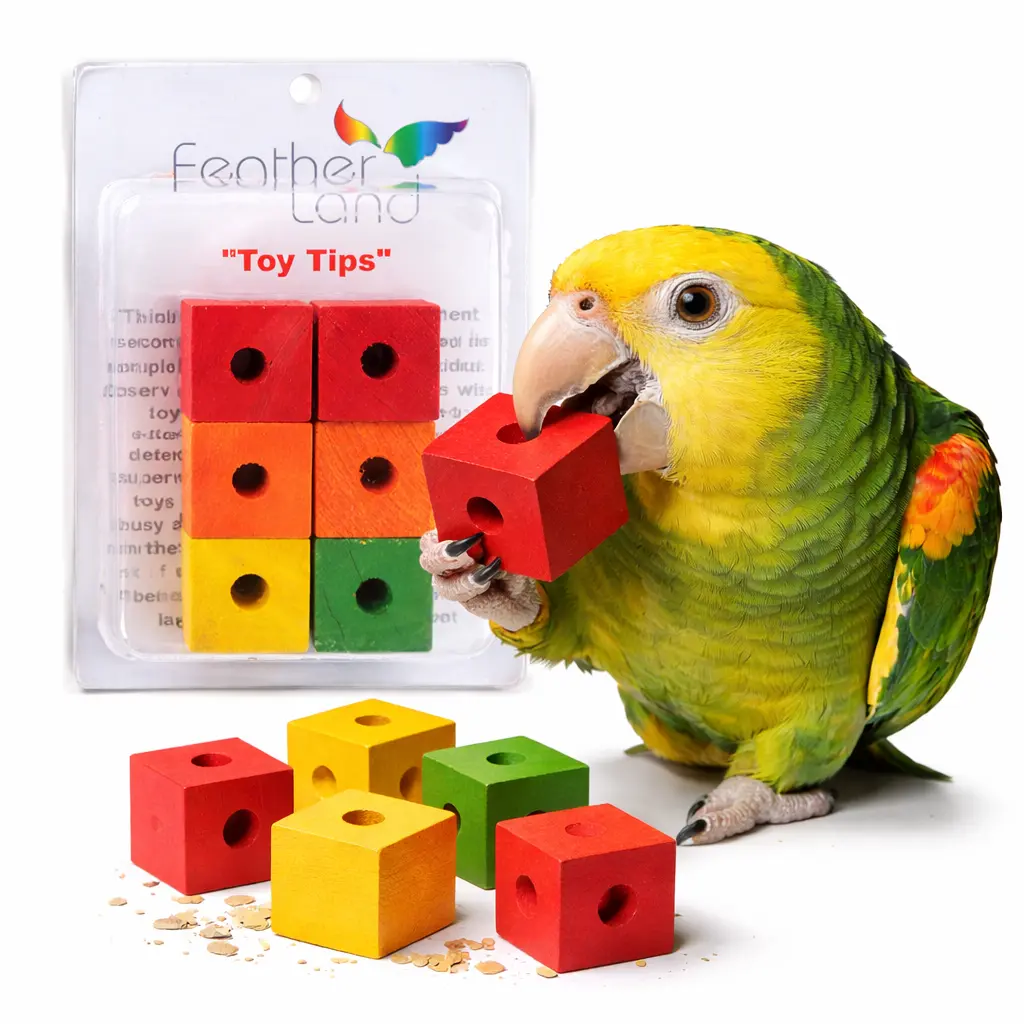 Każda kostka ma około 3 x 3 x 3 cm, co sprawia, że jest odpowiednia dla średnich i większych papug. Twarde drewno zapewnia trwałość, ale jednocześnie pozwala papudze skubać i rozdrabniać elementy, zaspokajając naturalną potrzebę niszczenia.