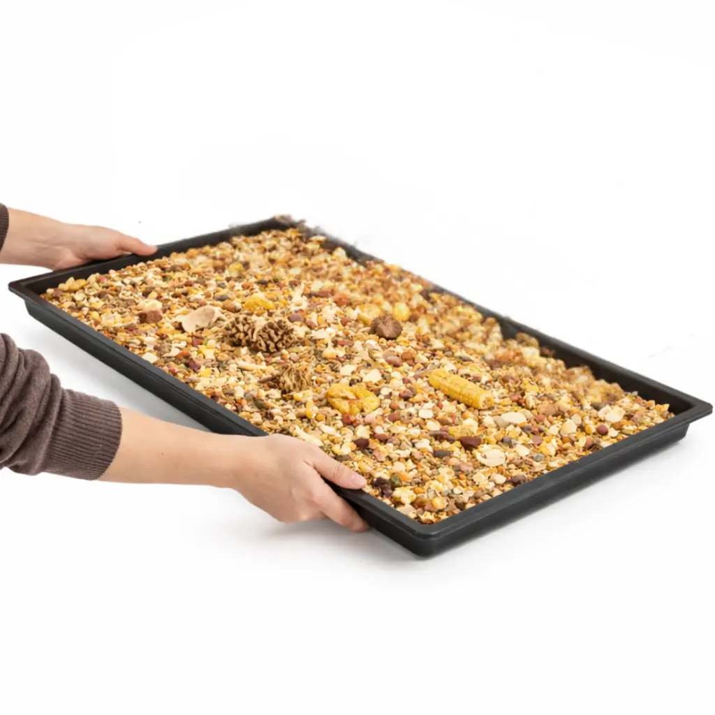 Dzięki dużej powierzchni możesz wsypać do środka ściółkę, korę, zrębki lub papier i ukryć w nich przysmaki, zioła czy granulaty. Papuga będzie musiała szukać jedzenia, co naturalnie angażuje ją psychicznie i fizycznie.
