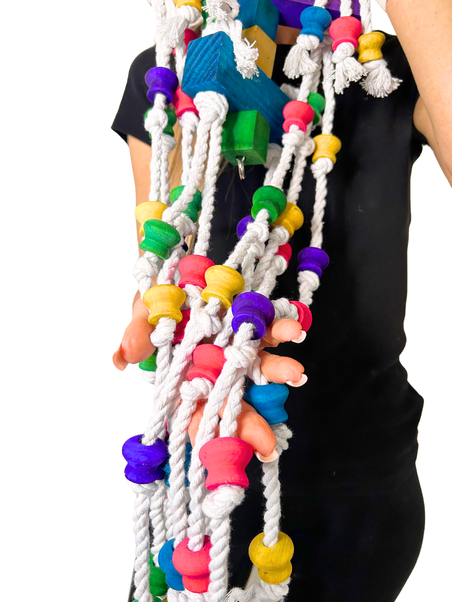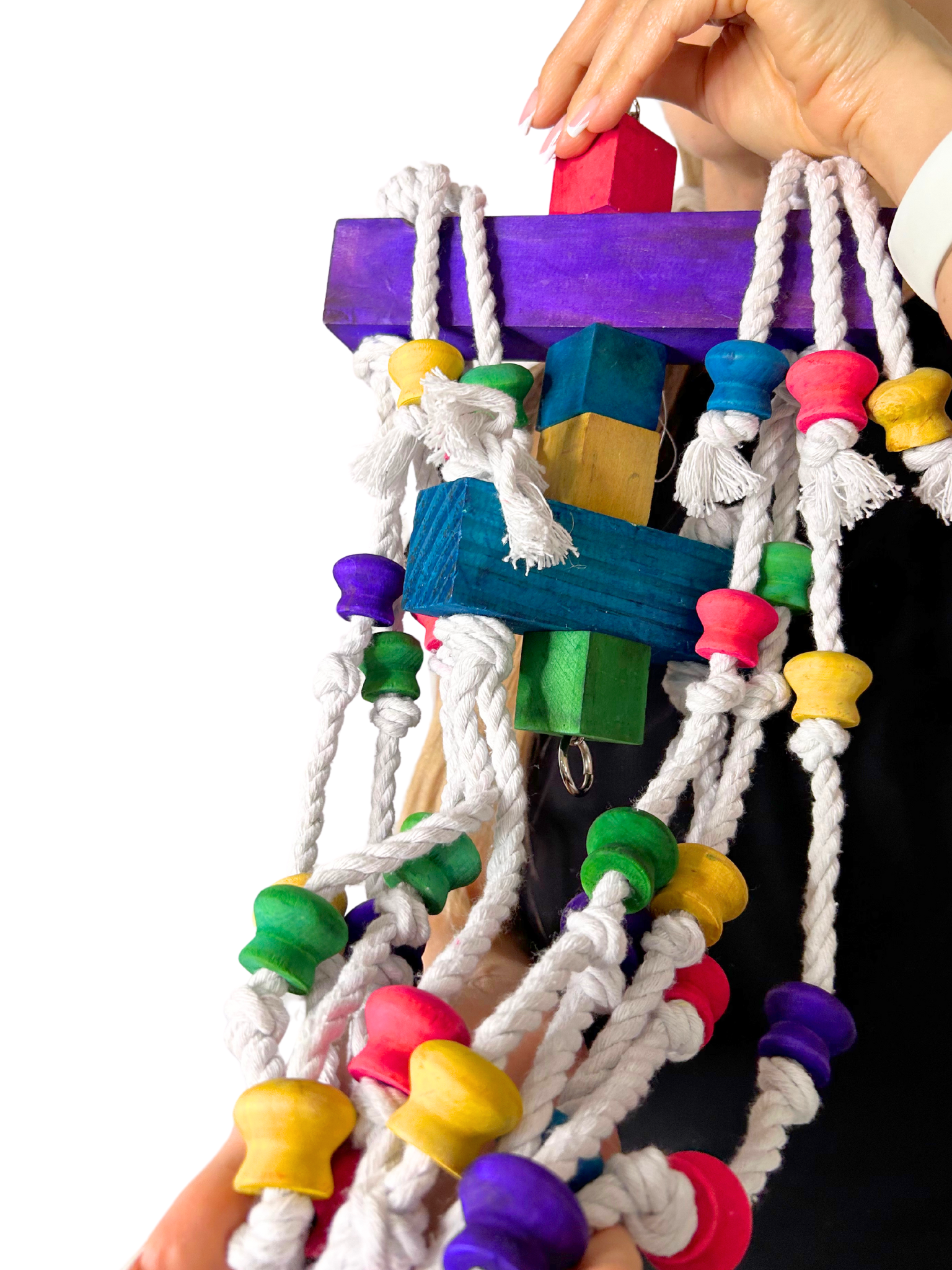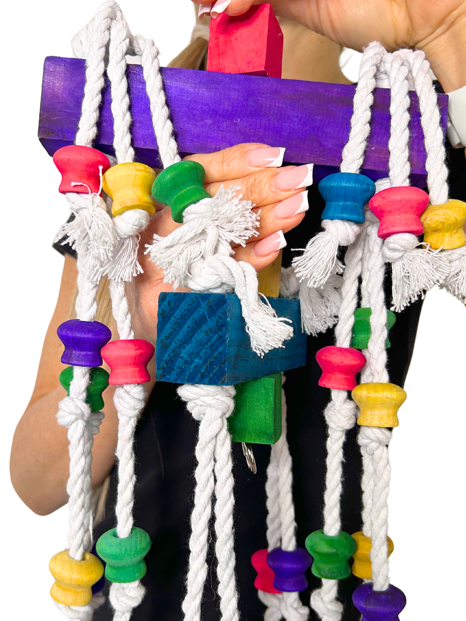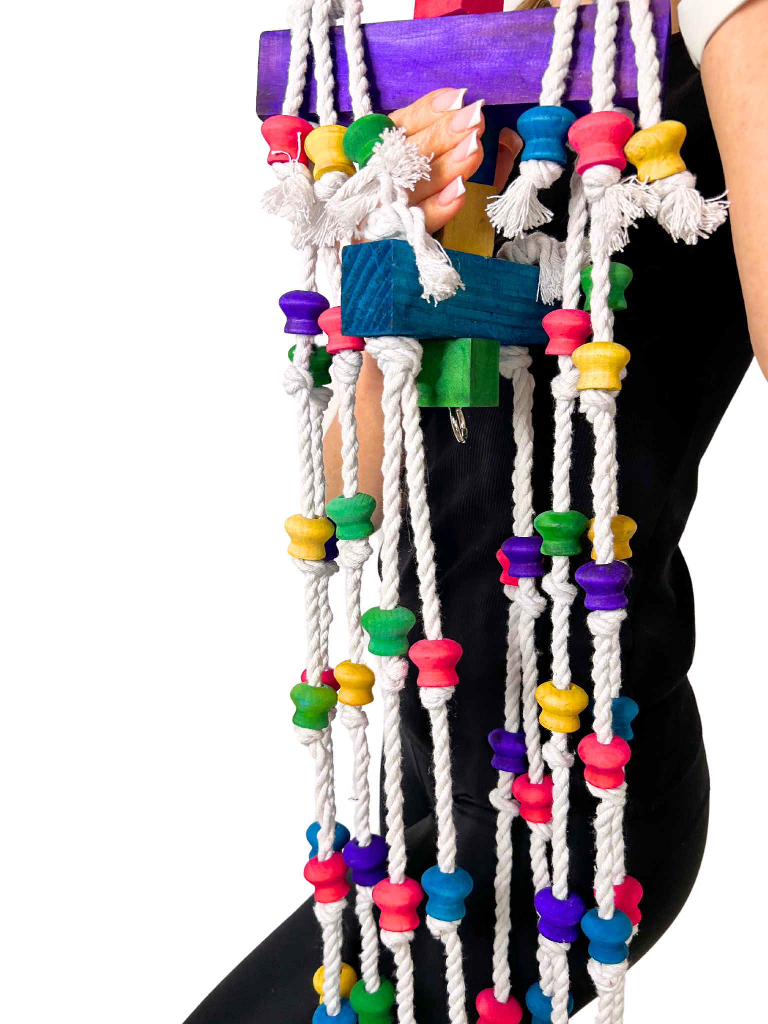 - Zabawka Longer dba o dobrostan Twoich papug, wykonana jest z najwyższej jakości materiałów, takich jak drewno, bawełna, stal i barwniki spożywcze, co zapewnia bezpieczną i przyjemną zabawę bez żadnych toksycznych składników.