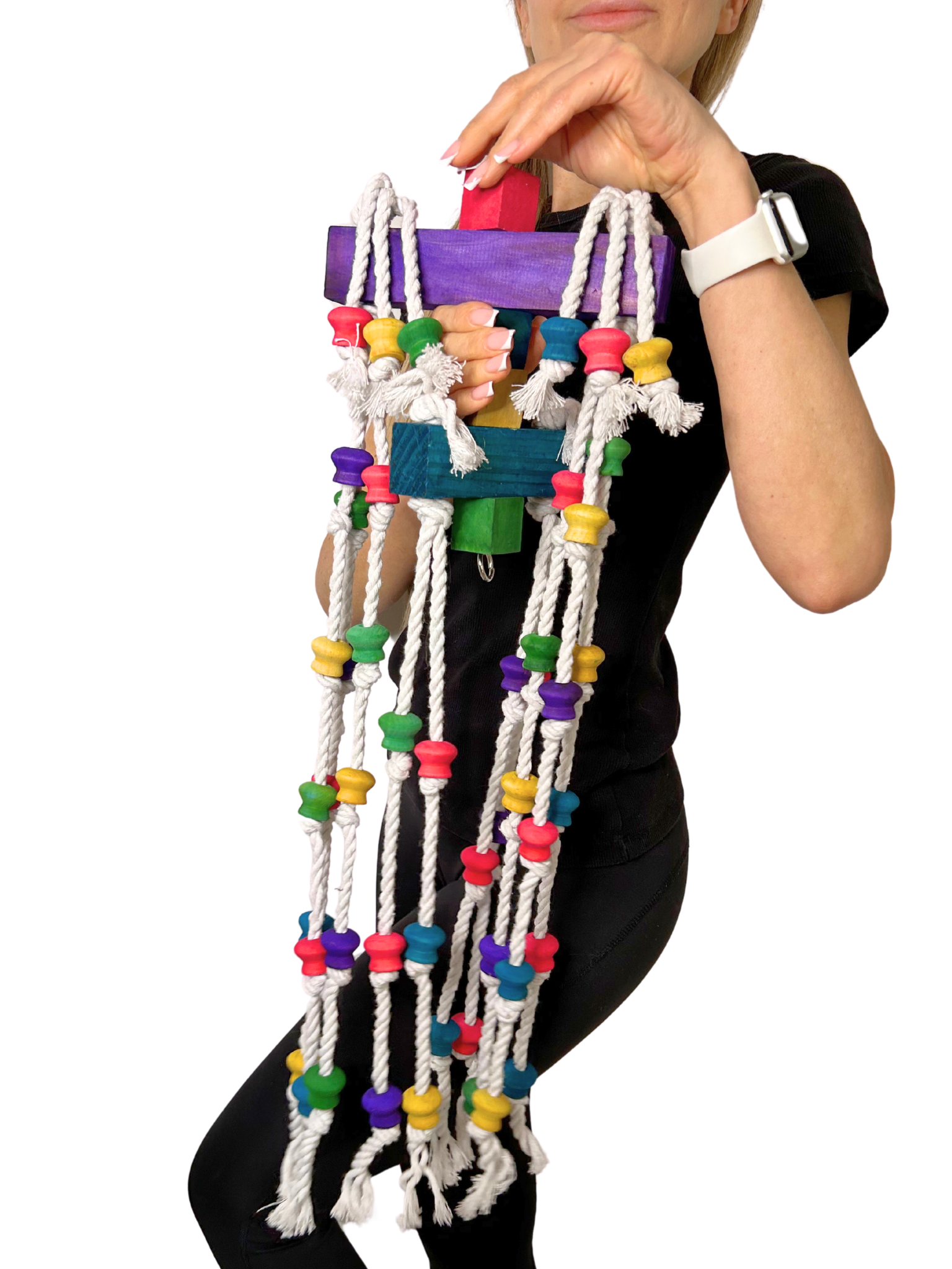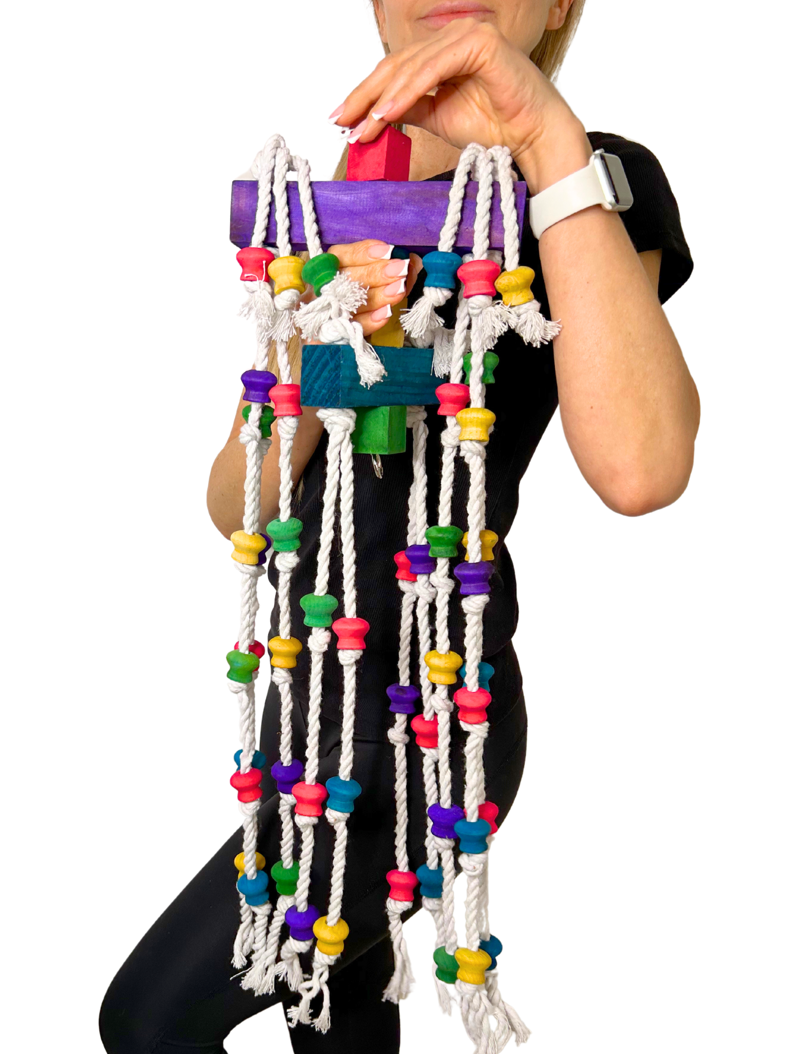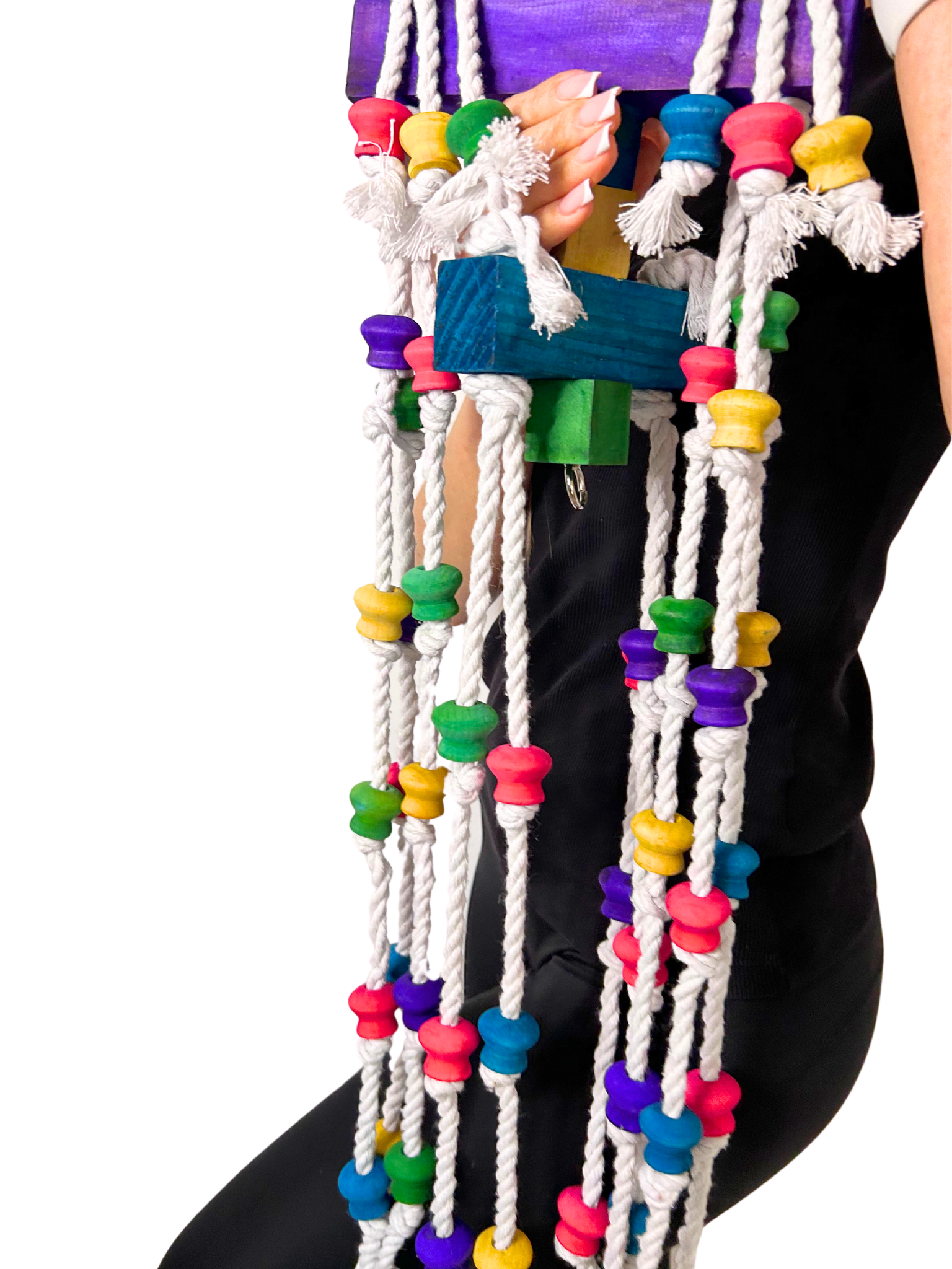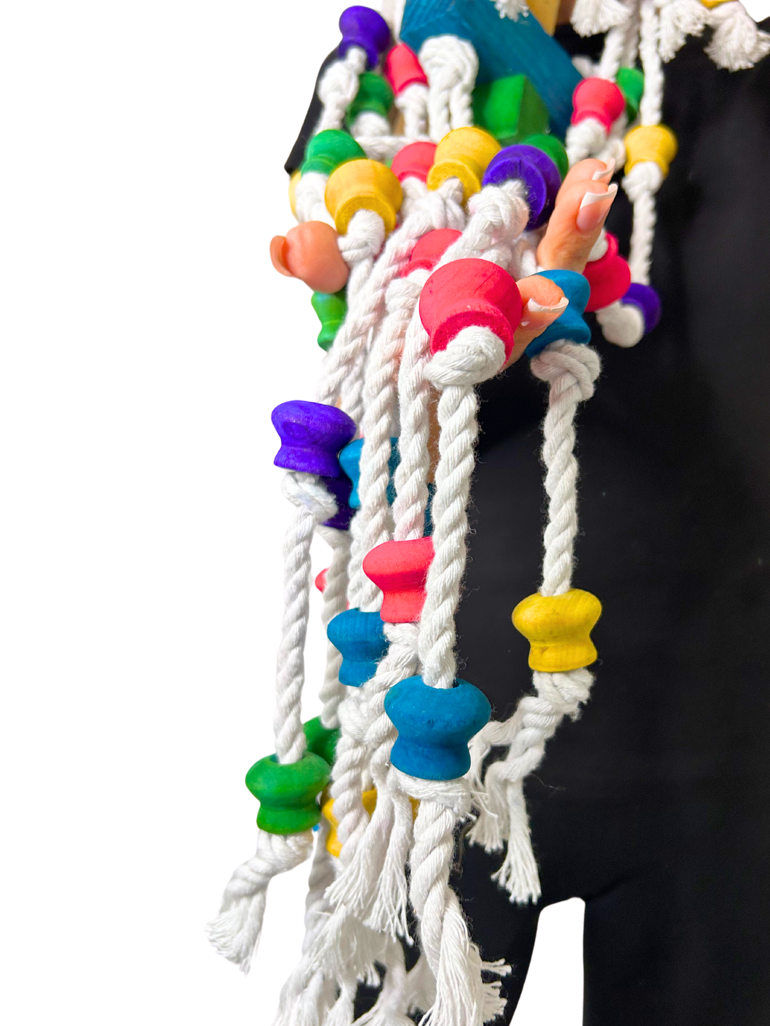 - Zabawka Longer dba o dobrostan Twoich papug, wykonana jest z najwyższej jakości materiałów, takich jak drewno, bawełna, stal i barwniki spożywcze, co zapewnia bezpieczną i przyjemną zabawę bez żadnych toksycznych składników.