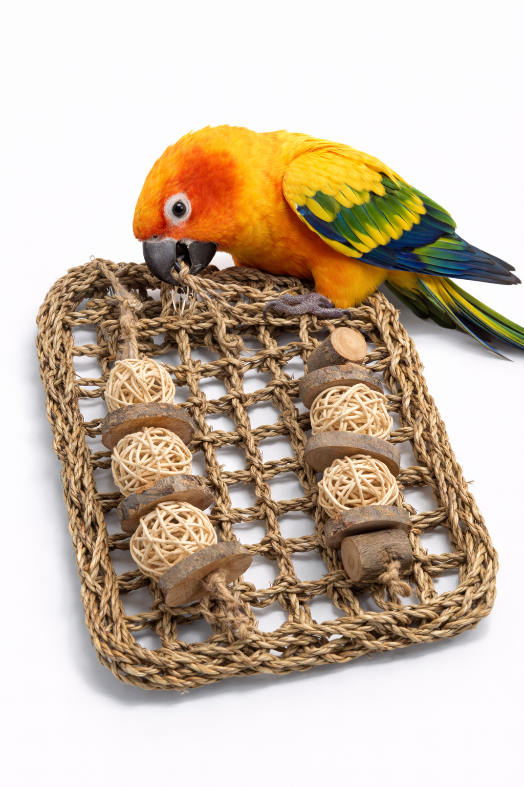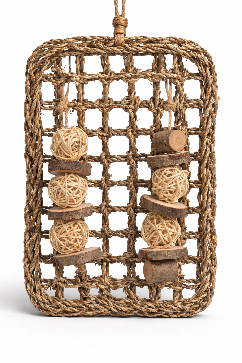 Wykonana w 100% z naturalnej trawy morskiej i rattanu, ręcznie zapleciona, zapewnia autentyczne doświadczenie żerowania. Struktura maty pozwala papudze wyciągać włókna, rozplatać elementy i manipulować dodatkami, co silnie aktywuje naturalne instynkty zdobywania pokarmu i pracy dziobem.
