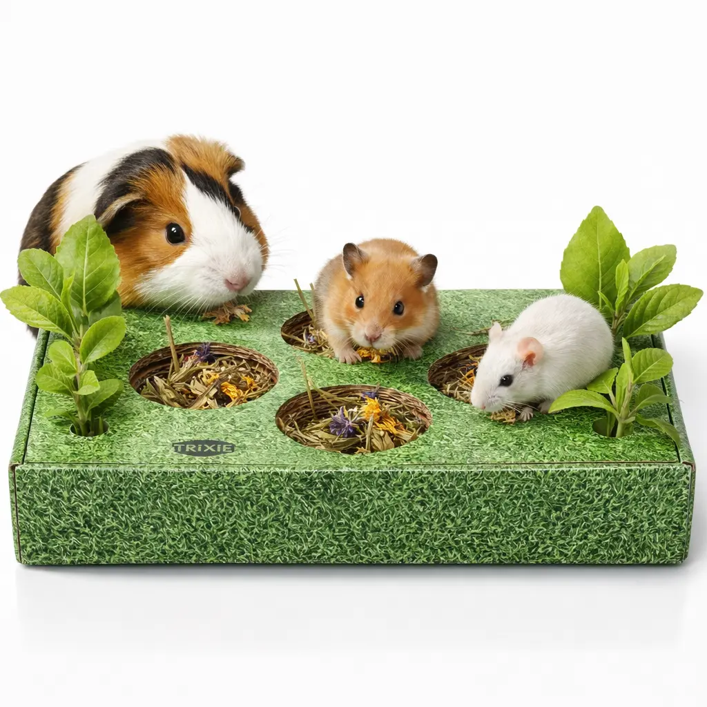 Gryzoń instynktownie zaczyna przeszukiwać otwory, wyciągać elementy i szukać ukrytych smakołyków. To dokładnie to, co robiłby w naturze.