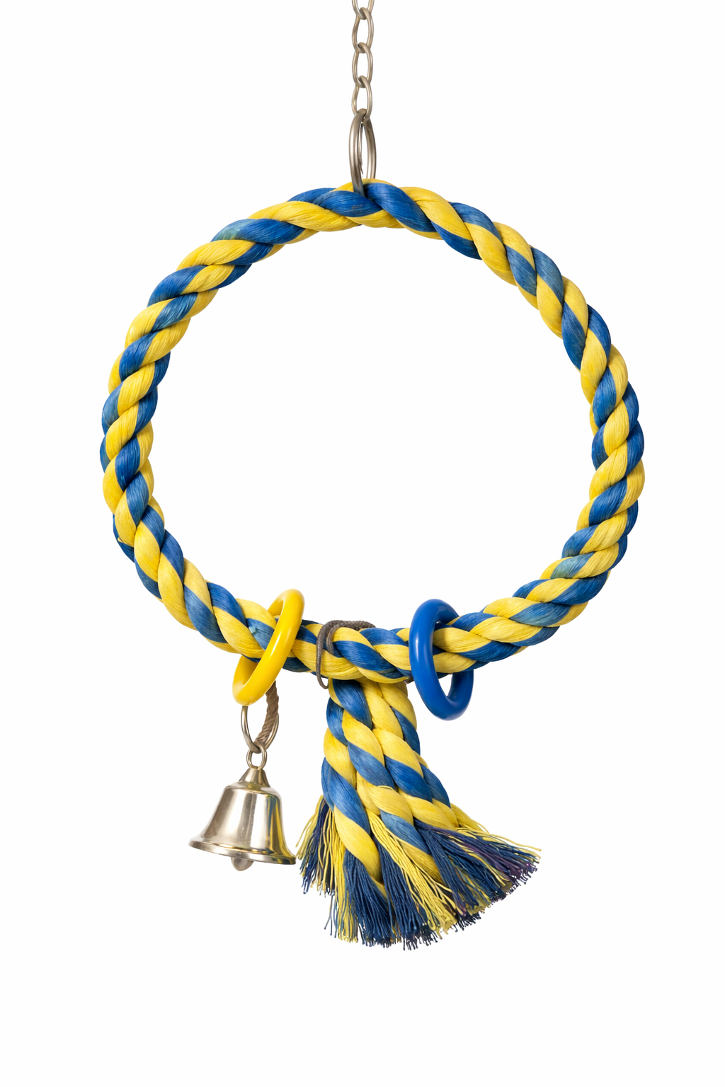 Mini Power Ring to lekka huśtawka w kształcie koła, wykonana z plecionej bawełnianej liny. Ruchoma konstrukcja zachęca papugę do balansowania, wspinania się i podgryzania elementów. Dodatkowe kolorowe obręcze oraz dzwoneczek zwiększają atrakcyjność zabawki i stymulują ciekawość.