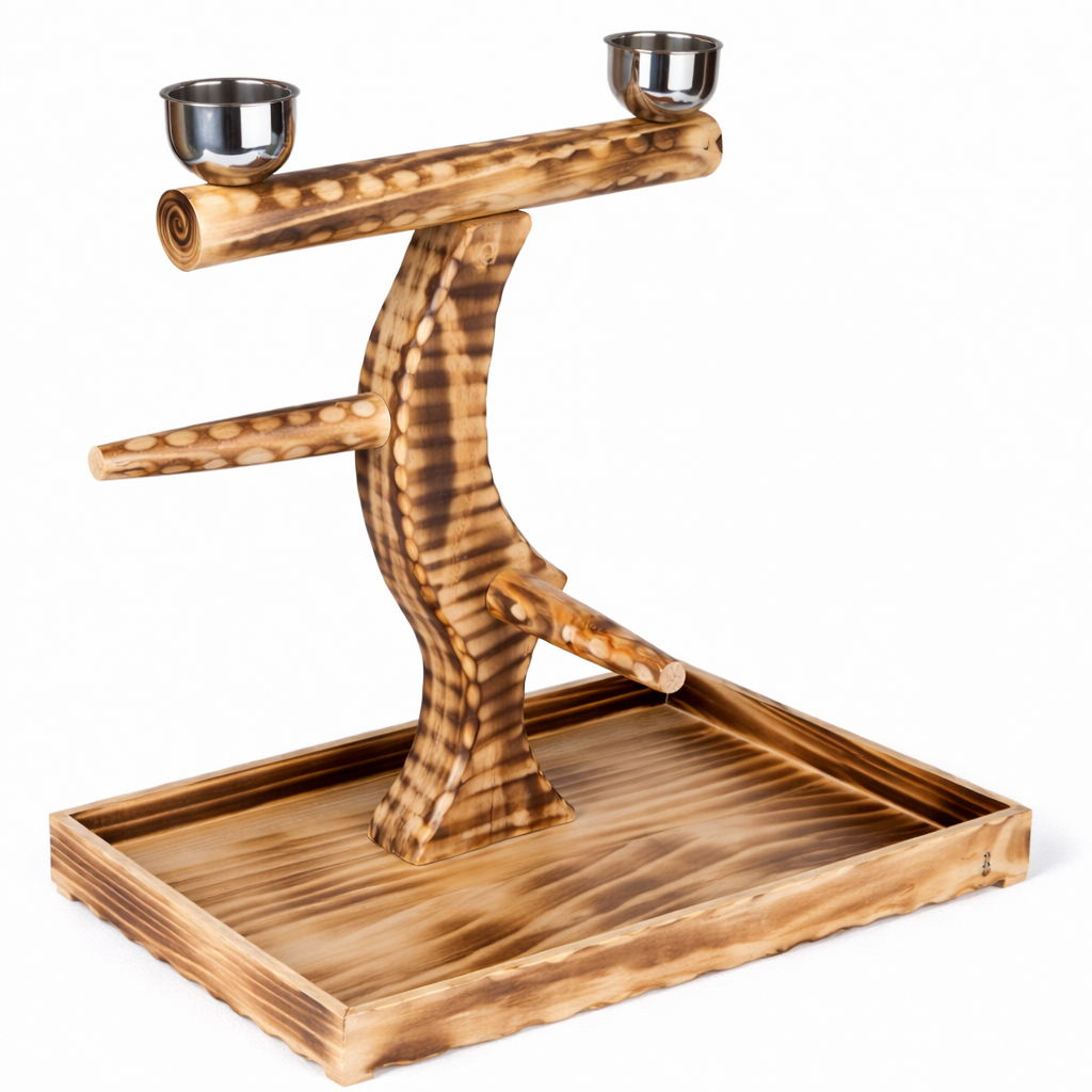 Drewniany stojak to funkcjonalne wyposażenie dla średnich i dużych papug, które potrzebują bezpiecznej przestrzeni do przebywania poza klatką. Umożliwia odpoczynek, obserwację otoczenia oraz codzienną aktywność w kontrolowanym miejscu.