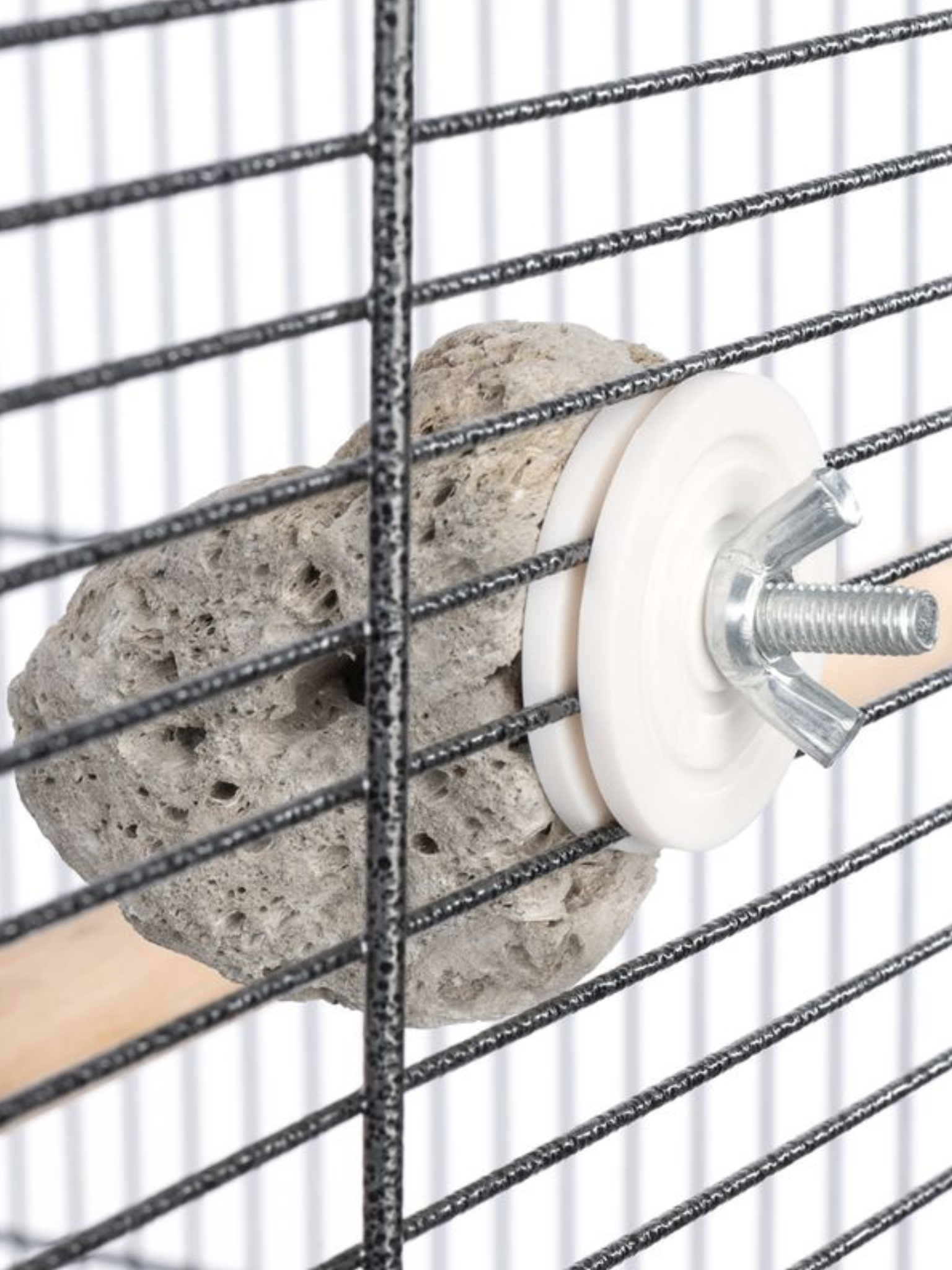 Dodatkowo kamień lawowy dostarcza papugom cennych minerałów, które są istotnym elementem ich diety. Dzięki prostemu systemowi mocowania na nakrętkę motylkową, kamień można bezpiecznie i stabilnie przymocować do siatki klatki, co pozwala papugom korzystać z niego w dowolnym momencie.