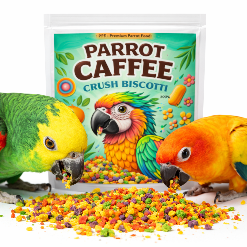 PARROT CAFFEE Crush Biscotti to drobno kruszone biszkopciki stworzone jako urozmaicenie codziennej diety papugi. Ich lekka, chrupiąca struktura sprawia, że ptak nie tylko je, ale również aktywnie podgryza i wybiera drobne kawałki, co wydłuża czas zajęcia.