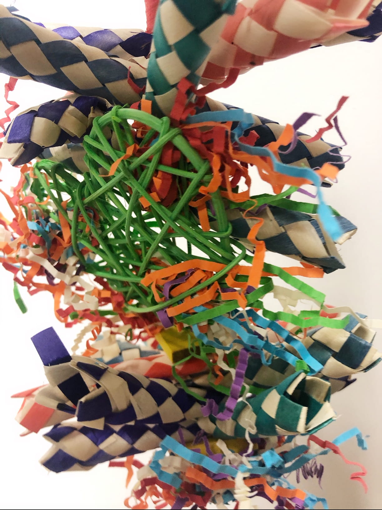 Plecione Patyczki z wiklinowym sercem" to zabawka stworzona z najbardziej lubianych przez papugi kształtów i kolorów. Składa się z 10 plecionych patyczków oraz wiklinowego serca, połączonych drewnianymi elementami.