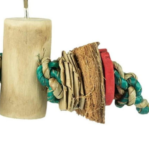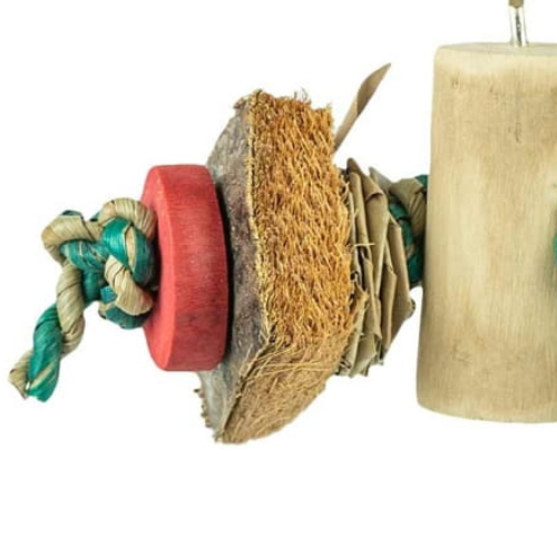 Podwójna radość- zabawka dla papug wykonana ręcznie z uluionych przez papugi materiałów takich jak kawałki kokosa, mata kukurydziana i chrupiące drewno!