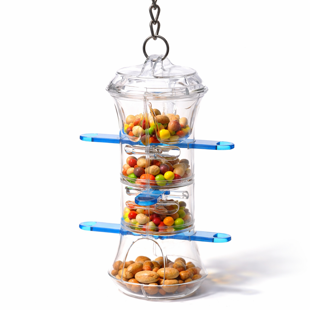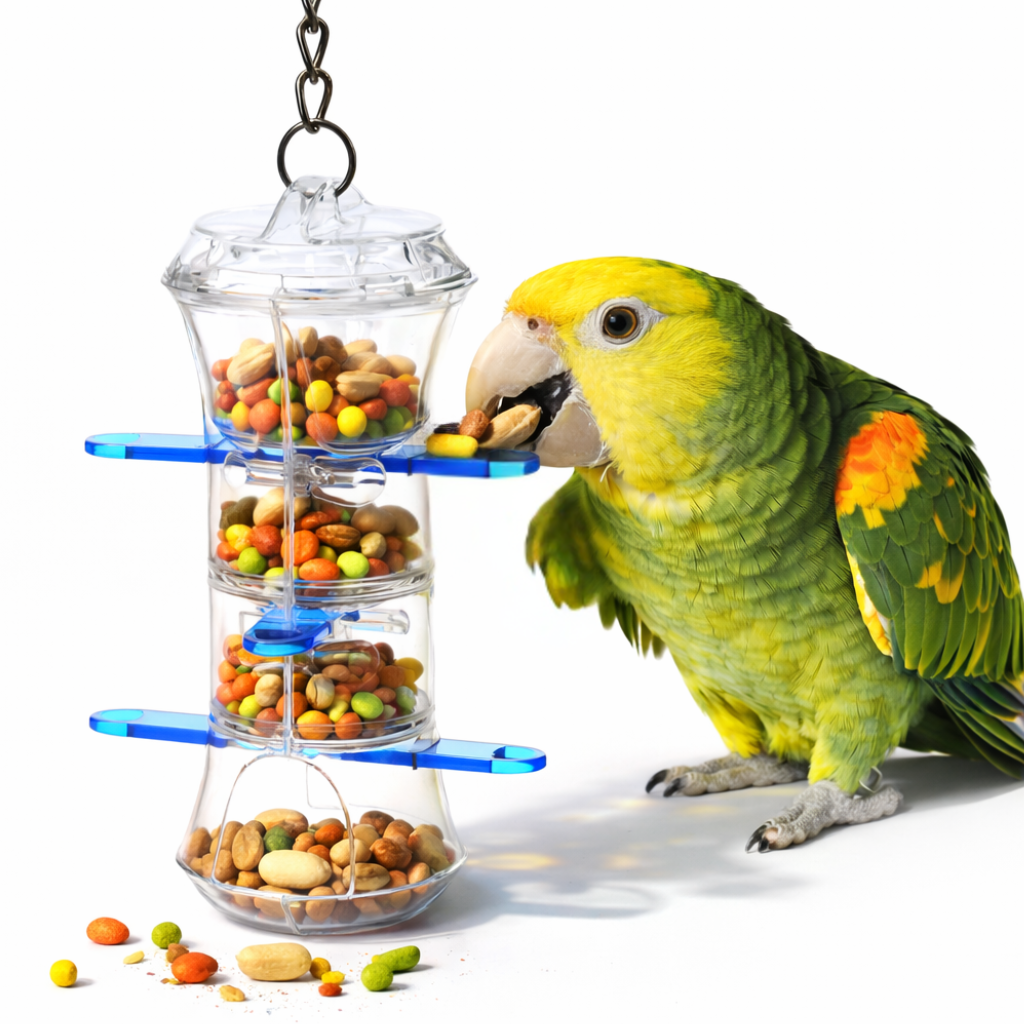 Zabawka składa się z 4 niezależnych komór, w których można ukryć smakołyki, kawałki owoców lub ulubioną karmę. Papuga musi manipulować elementami, aby dostać się do nagrody, co rozwija jej zdolności poznawcze i zręczność.