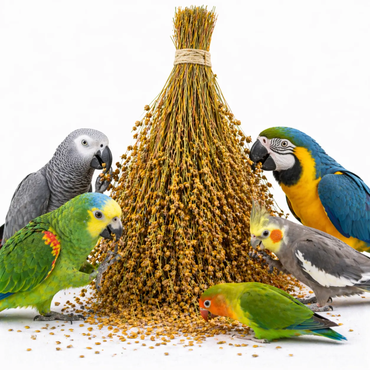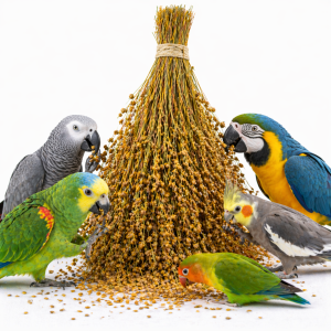 W zależności od gatunku papugi podawać do kilku kłosów tygodniowo jako uzupełnienie zbilansowanej diety. Produkt nie zastępuje podstawowej karmy.