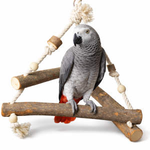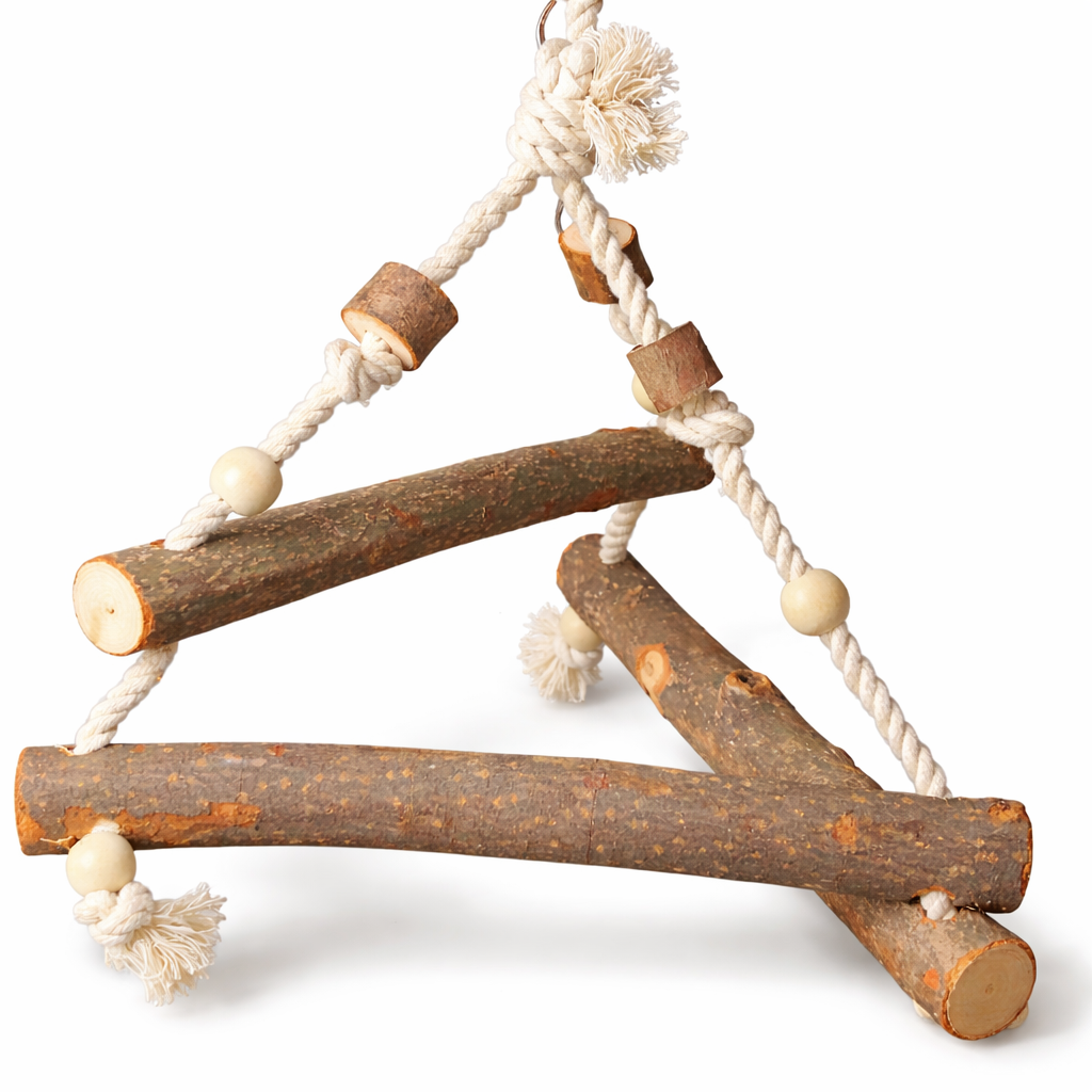 Trójkąt – Drewniana Huśtawka dla Średnich i Dużych Papug to w pełni naturalna zabawka, która łączy funkcję żerdzi i huśtawki w jednej konstrukcji. Trójkątny kształt daje papudze kilka punktów podparcia, co zwiększa komfort chwytu i zachęca do aktywności.