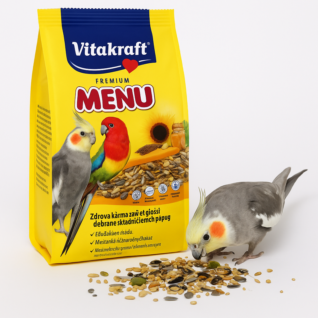 VITAKRAFT Menu dla nimf i średnich papug 1 kg to pełnoporcjowa, naturalna mieszanka ziaren stworzona z myślą o zdrowiu i wysokiej witalności ptaków. Karma zawiera starannie dobrane składniki: wartościowe nasiona, wysokiej jakości ziarna zbóż, orzechy oraz naturalny miód. Dodatek granulek Vital zapewnia kompleks witamin i minerałów wspierających odporność oraz prawidłową pracę organizmu.