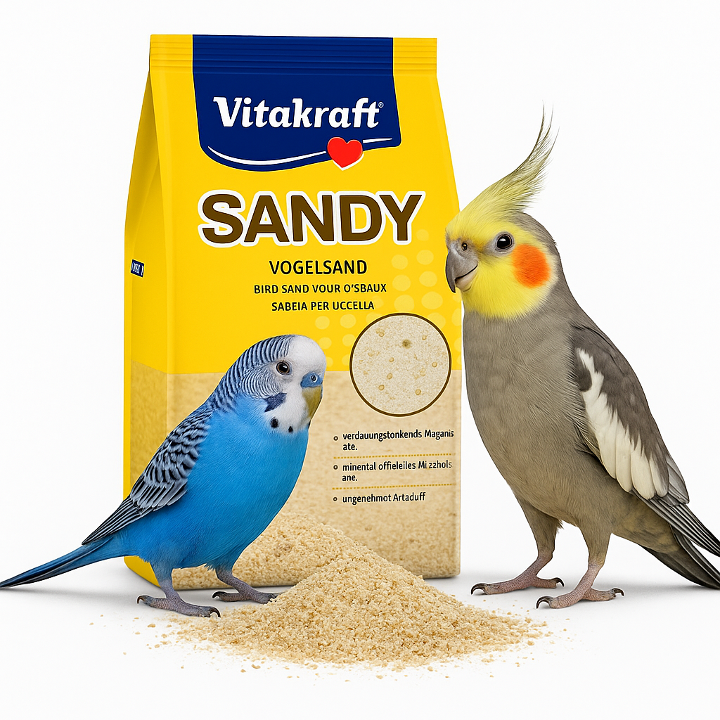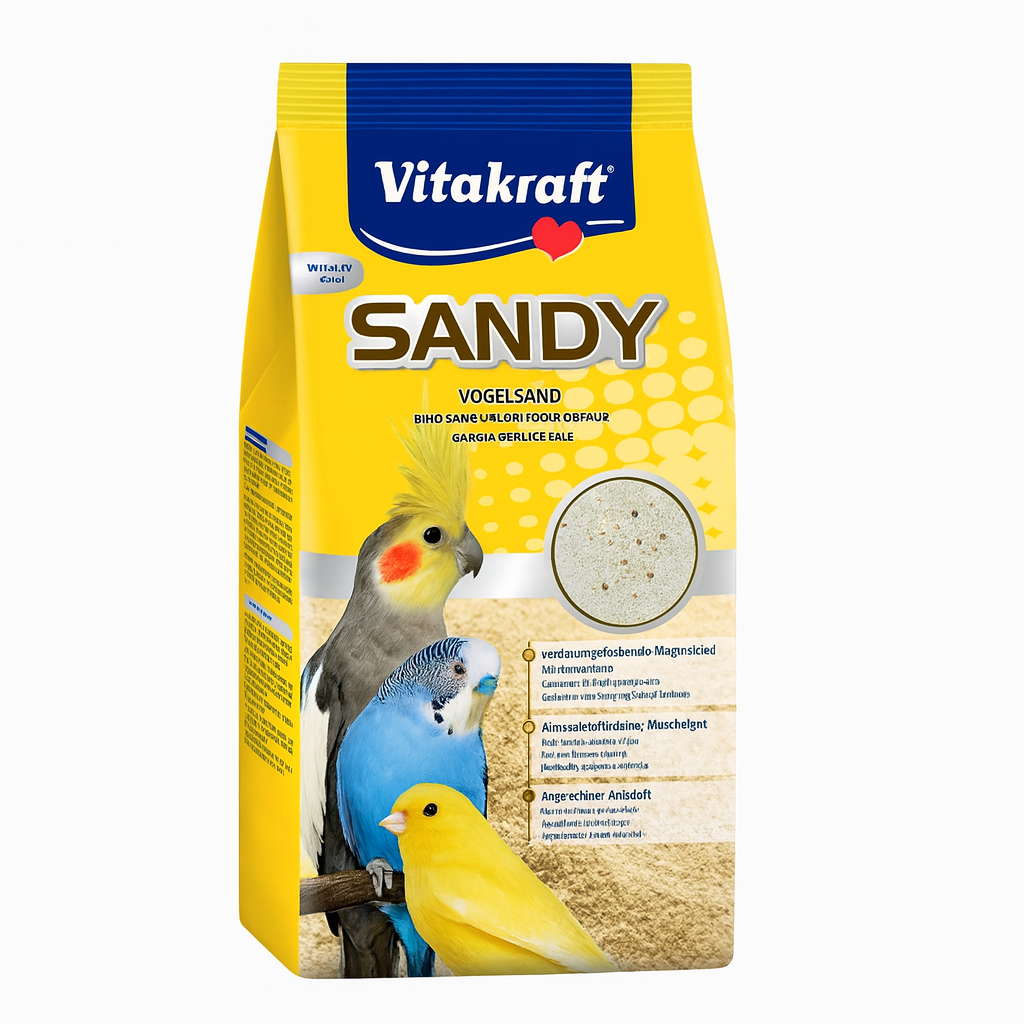 Vitakraft Sandy to wysokiej jakości piasek przeznaczony do utrzymania higieny w klatkach ptaków. Zawiera naturalny piasek kwarcowy, drobno mielone muszle oraz aromat anyżu, który odświeża klatkę i tworzy bardziej komfortowe środowisko dla ptaków. Dodatek muszli stanowi naturalne źródło minerałów, wspierając układ trawienny.