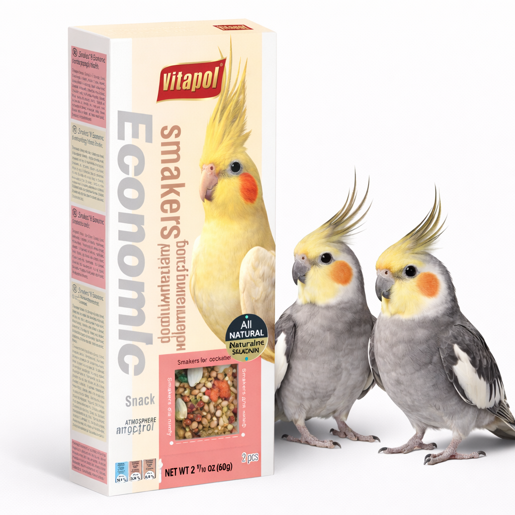 Vitapol – Smakers ECONOMIC dla Nimf to uzupełniająca przekąska oparta na mieszance wartościowych ziaren i nasion, zaprojektowana specjalnie dla nimf. Forma kolby sprawia, że ptak musi aktywnie zdobywać pokarm, co wydłuża czas żerowania i ogranicza nudę w klatce.