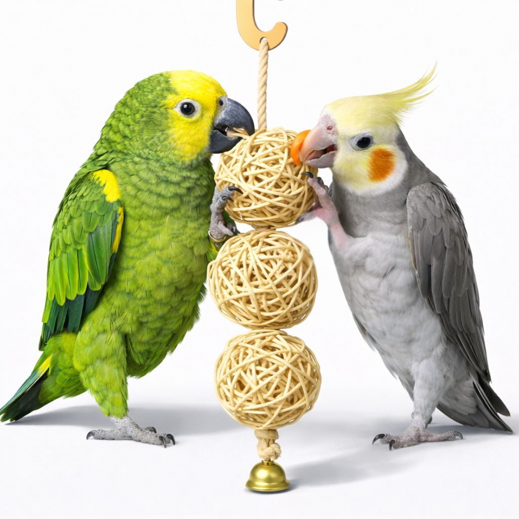 Regularna zabawa pomaga utrzymać dobrą kondycję psychiczną i fizyczną papugi. Rattan i drewno pozwalają na bezpieczne gryzienie i szarpanie.