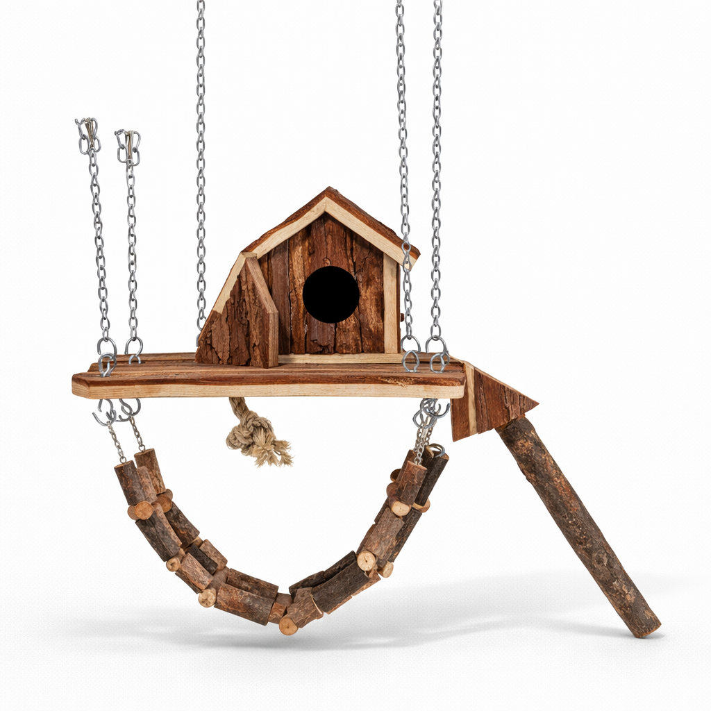 Wieszany Plac Zabaw to kompaktowa, wieloelementowa zabawka, która daje papudze przestrzeń do wspinaczki, balansowania i aktywnej eksploracji. Dzięki zawieszeniu w górnej części klatki naturalnie zachęca do ruchu w pionie – dokładnie tak, jak w środowisku naturalnym.